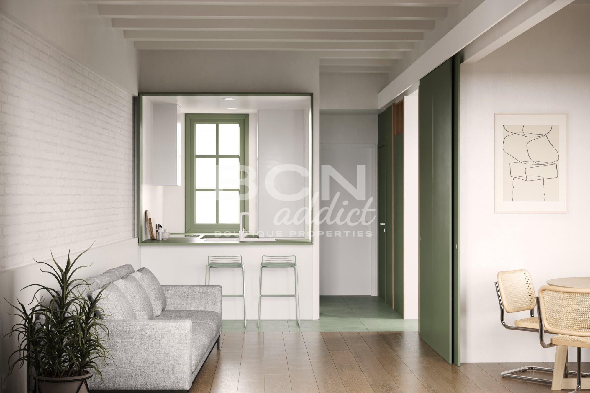 Search Nice apartment of 61 m2 plus 20 m2 of private terrace on the roof of the building. They are located in the Eixample Dret neighbourhood, next to the new Les Glòries park and with very good metro connections due to their proximity to the Encants, Monumental and Glories stations. It is a real second floor located in an old building, with characteristics typical of the architecture of Barcelona at the end of the 19th century. The building has just been completely rehabilitated, conserving all its characteristic elements of a royal estate, but updating it to the new needs and comforts of habitability. The comprehensive reform of the building includes structure, common facilities, main facade, patios, stairs, roof and elevator.