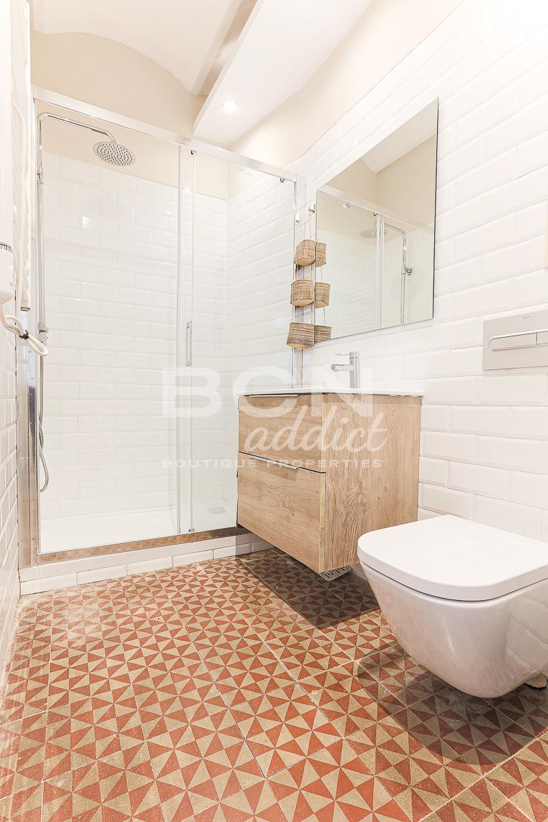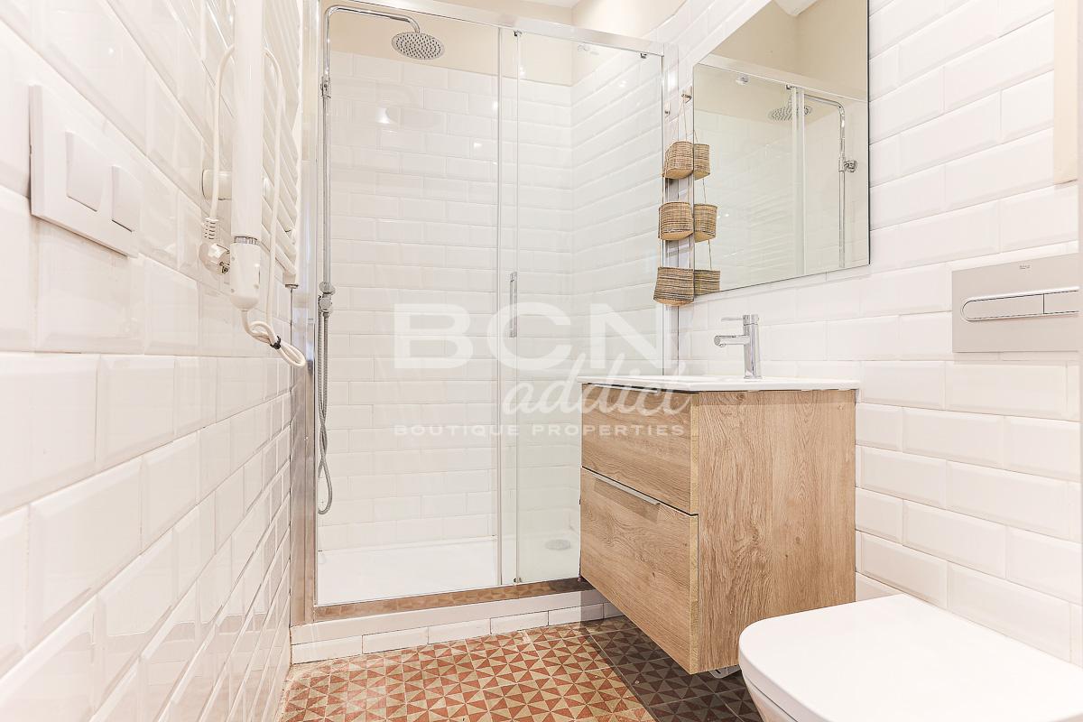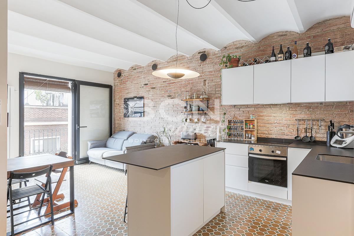 of Barcelona: ceramic floors, exposed brick walls and the famous Catalan ceiling. The white tones of the walls and ceiling gives the apartment a special feeling combining modernity and authenticity.