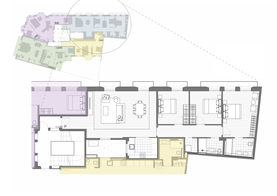 The adjoining rectangular floor plan has been redesigned to optimize its 3.50 meter high ceilings and take advantage of natural light throughout the day.