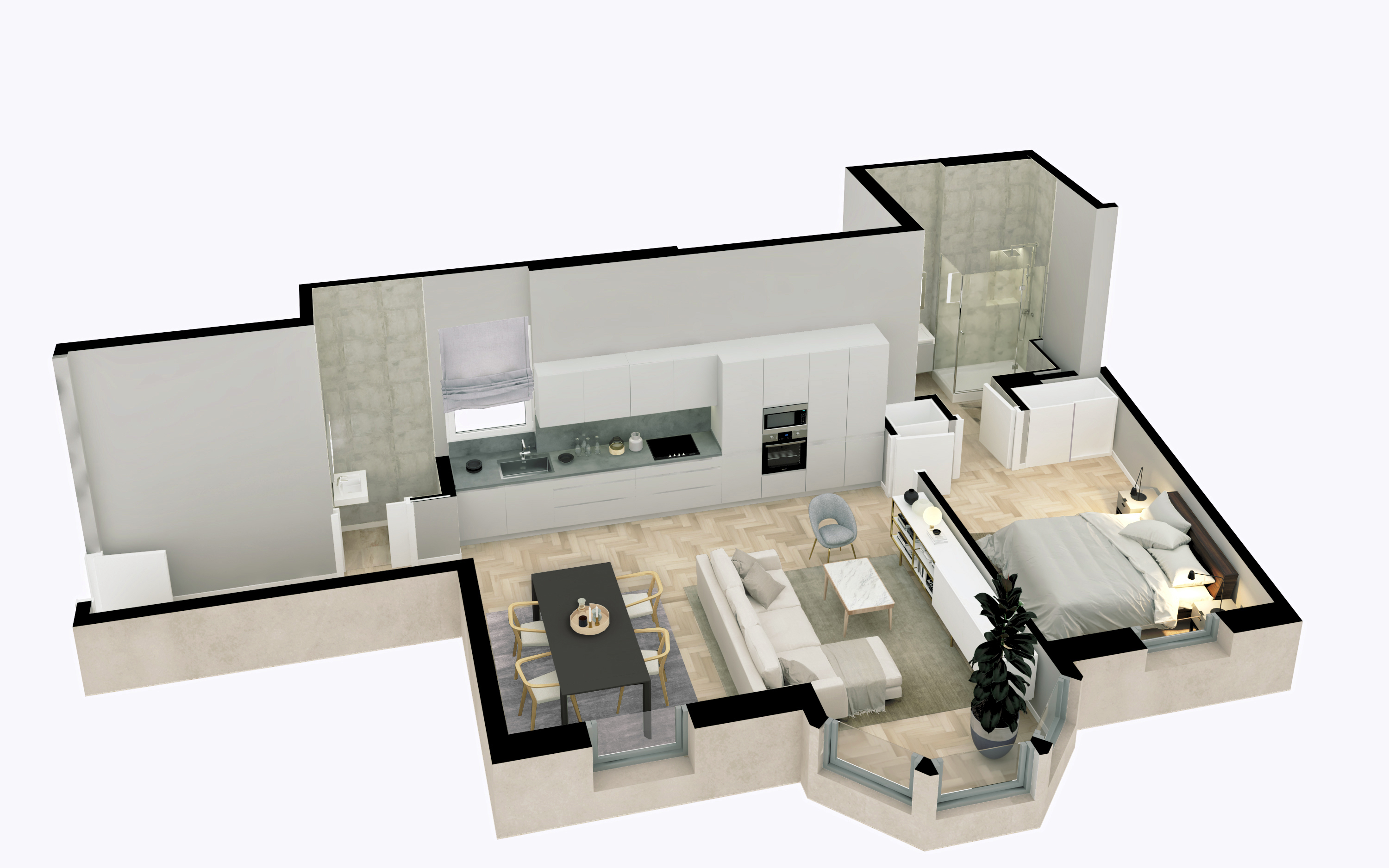 On its 66 m2, the apartment offers a very large living room with open kitchen followed by a suite.