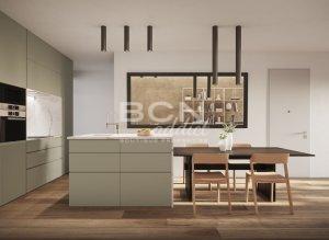 This flat, located on the third floor, has an interior built area of 70,96 sqm, the private use of a 15.75 sqm terrace on the roof of the building, 3 balconies that add up to 4,41 sqm and 16,84 sqm of common elements. The day area is a spacious living-dining room with open plan kitchen and a balcony overlooking the street. The night area has 2 double en-suite bedrooms, each with its own private bathroom and a balcony facing the inner courtyard of the block, facing south. Its distribution favours the entry of natural light and cross ventilation. In addition, the flat has a solarium terrace on the rooftop of the building, perfect for outdoor dining or relaxing and enjoying Barcelona’s pleasant weather all year round.