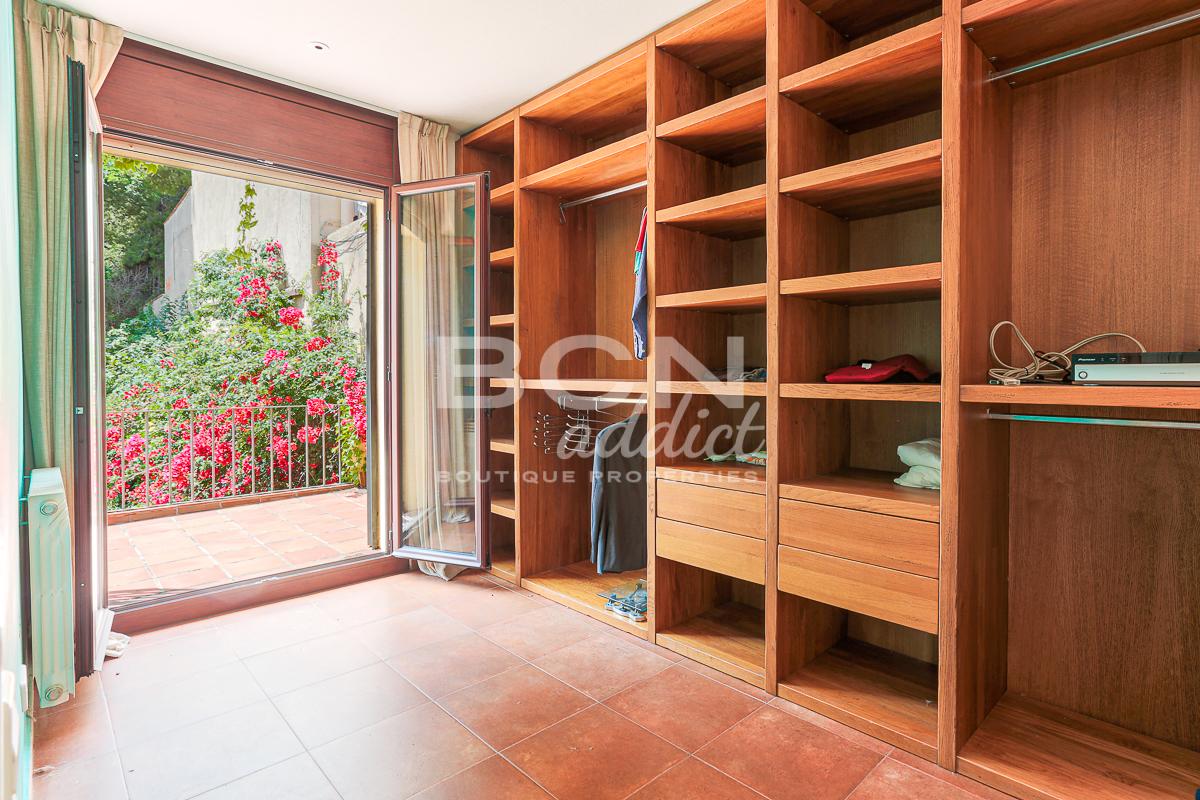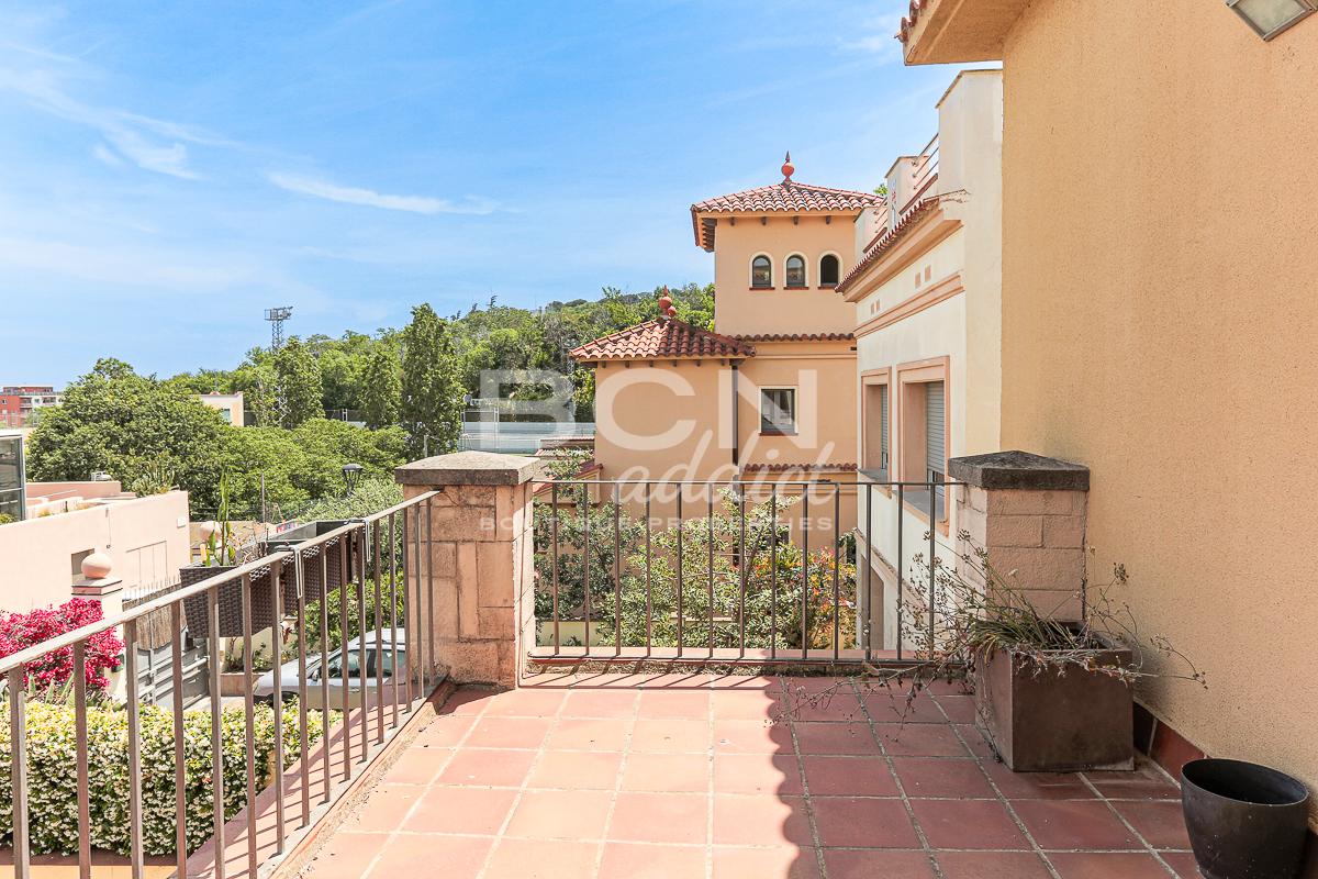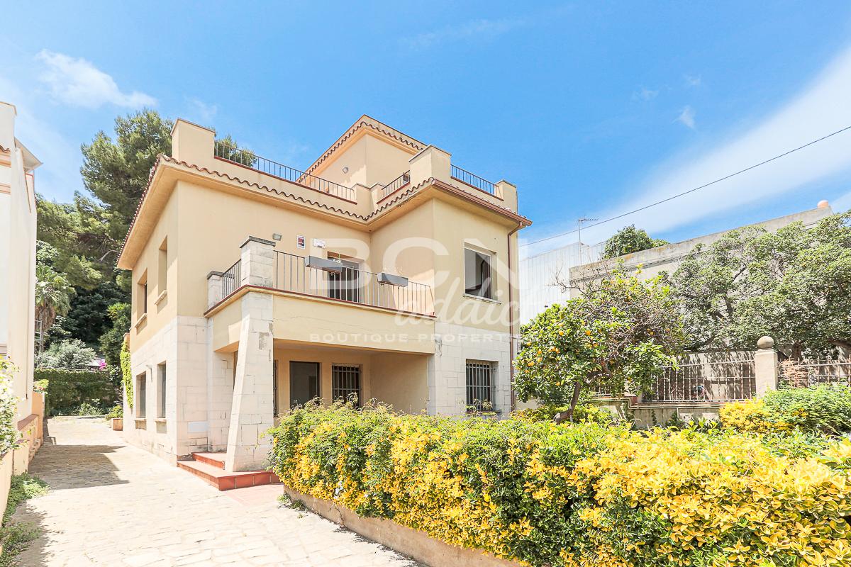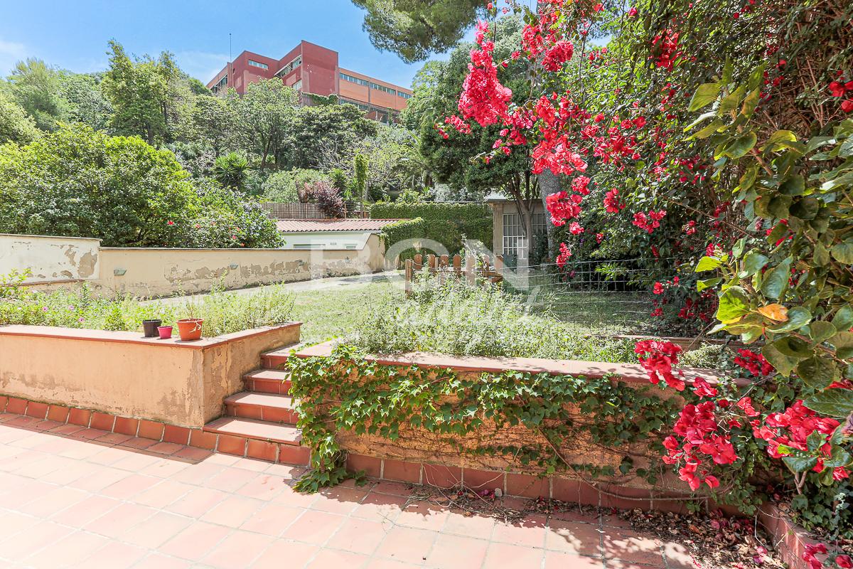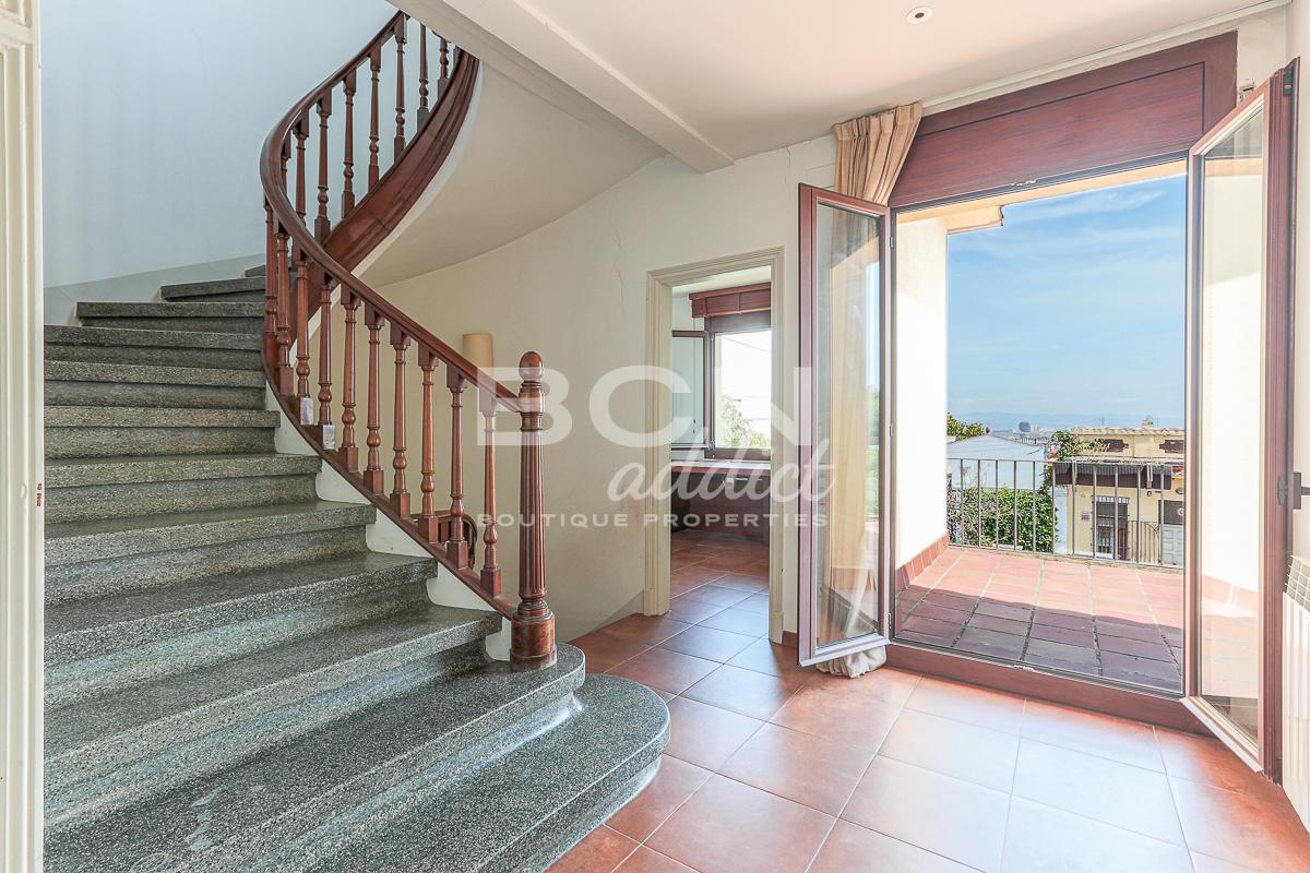 We enter the house through a porch and on the ground floor we find a spacious living room with views over the garden and a fireplace, a large kitchen with dining area and direct access to the garden, a toilet with shower and a convenient storage room. Going up the staircase with classic shapes and wooden balustrade, we reach the first floor where, through a central space, we access 4 bedrooms (two of which with direct access to the terrace towards the garden), a comfortable bathroom and a first terrace from where we can admire the whole city up to the Serrallada Litoral. Finally, on the second and last floor we find a practical office and the magnificent terrace from which to enjoy one of the best panoramic views of Barcelona, surrounded by the tranquillity and nature of the magnificent parks of Montjuic.