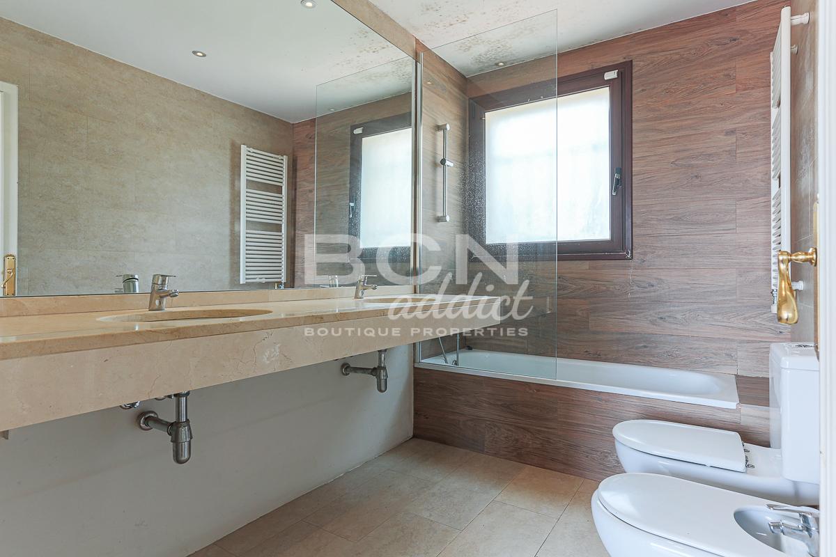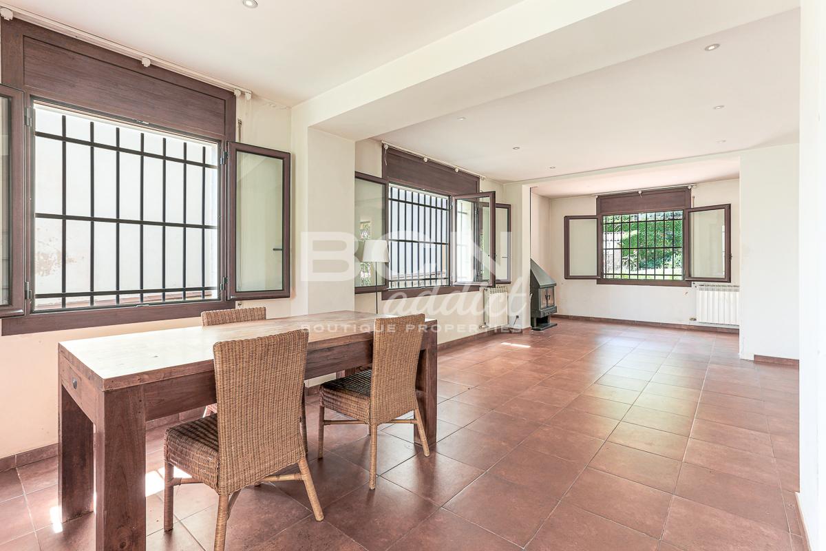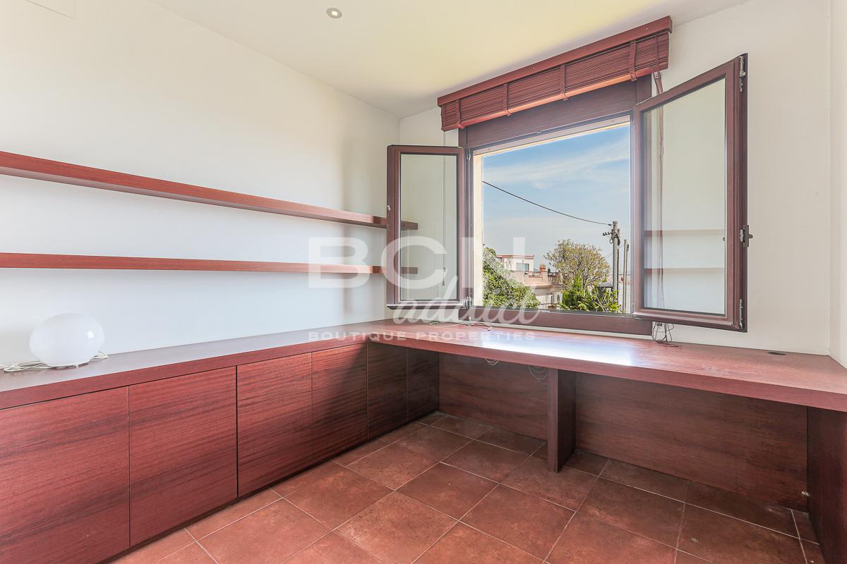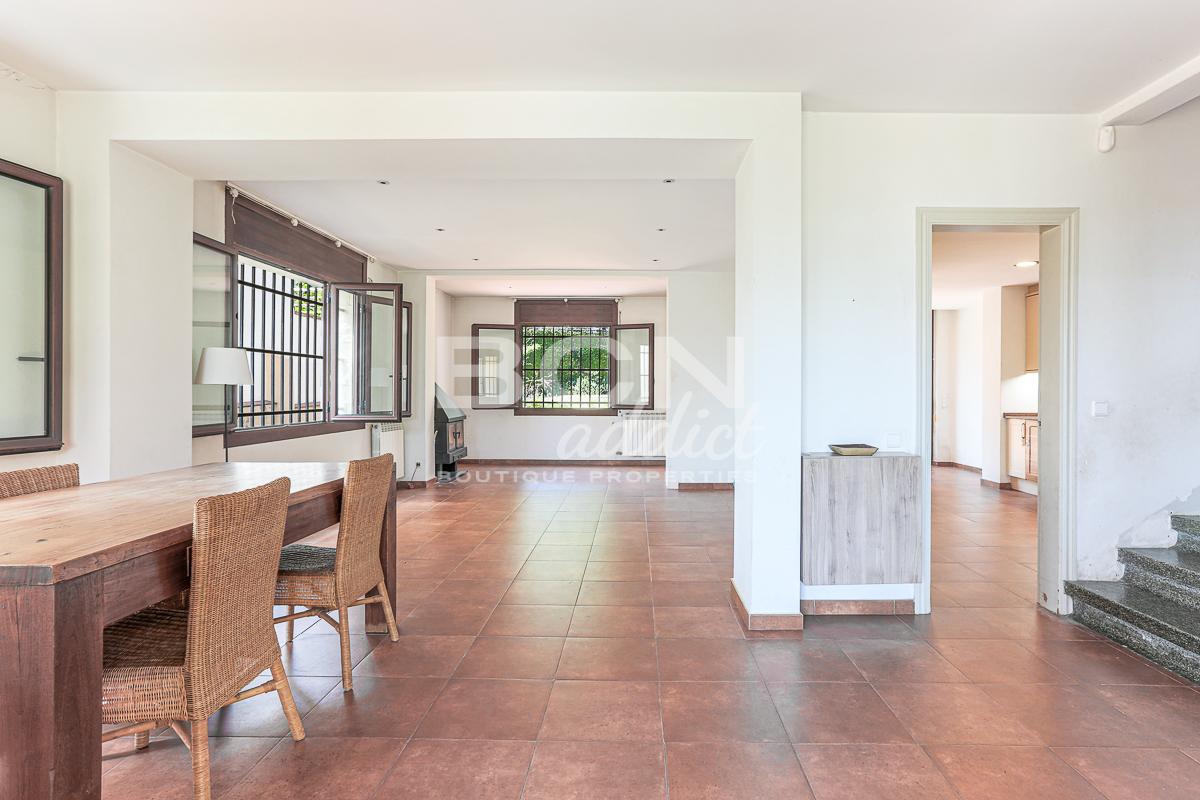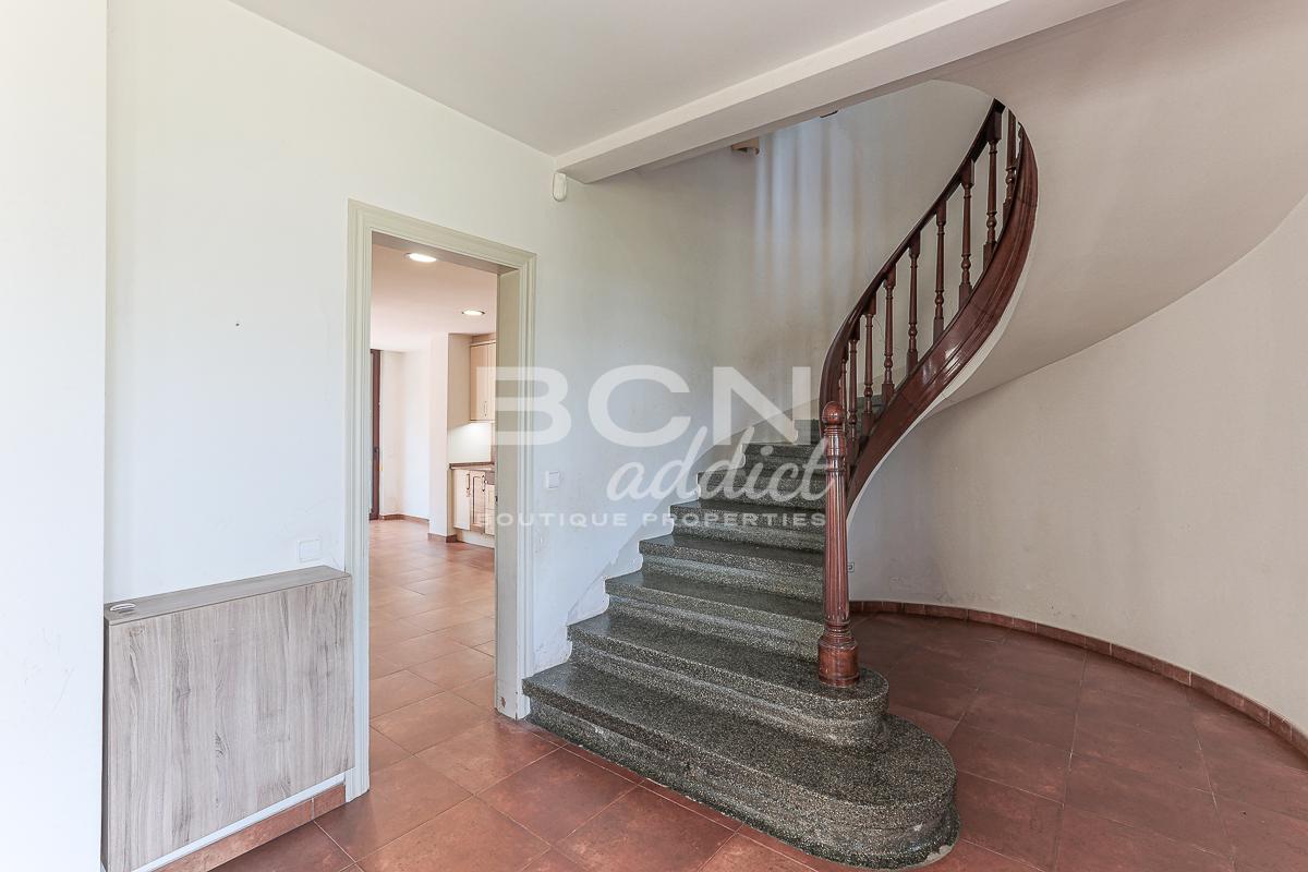 We enter the house through a porch and on the ground floor we find a spacious living room with views over the garden and a fireplace, a large kitchen with dining area and direct access to the garden, a toilet with shower and a convenient storage room. Going up the staircase with classic shapes and wooden balustrade, we reach the first floor where, through a central space, we access 4 bedrooms (two of which with direct access to the terrace towards the garden), a comfortable bathroom and a first terrace from where we can admire the whole city up to the Serrallada Litoral. Finally, on the second and last floor we find a practical office and the magnificent terrace from which to enjoy one of the best panoramic views of Barcelona, surrounded by the tranquillity and nature of the magnificent parks of Montjuic.