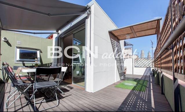 Rechercher Loft dans le quartier du borne avec une terrasse à 180 degrés et 2 vues spectaculaires, une a Santa Maria del Mar et la deuxième a la Cathédrale : la terrasse fait le tour de l’appartement.