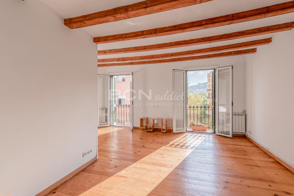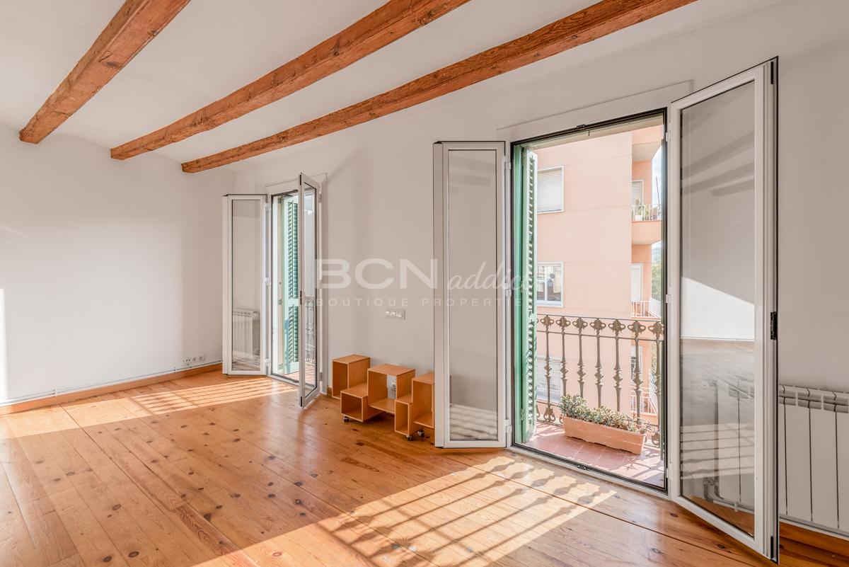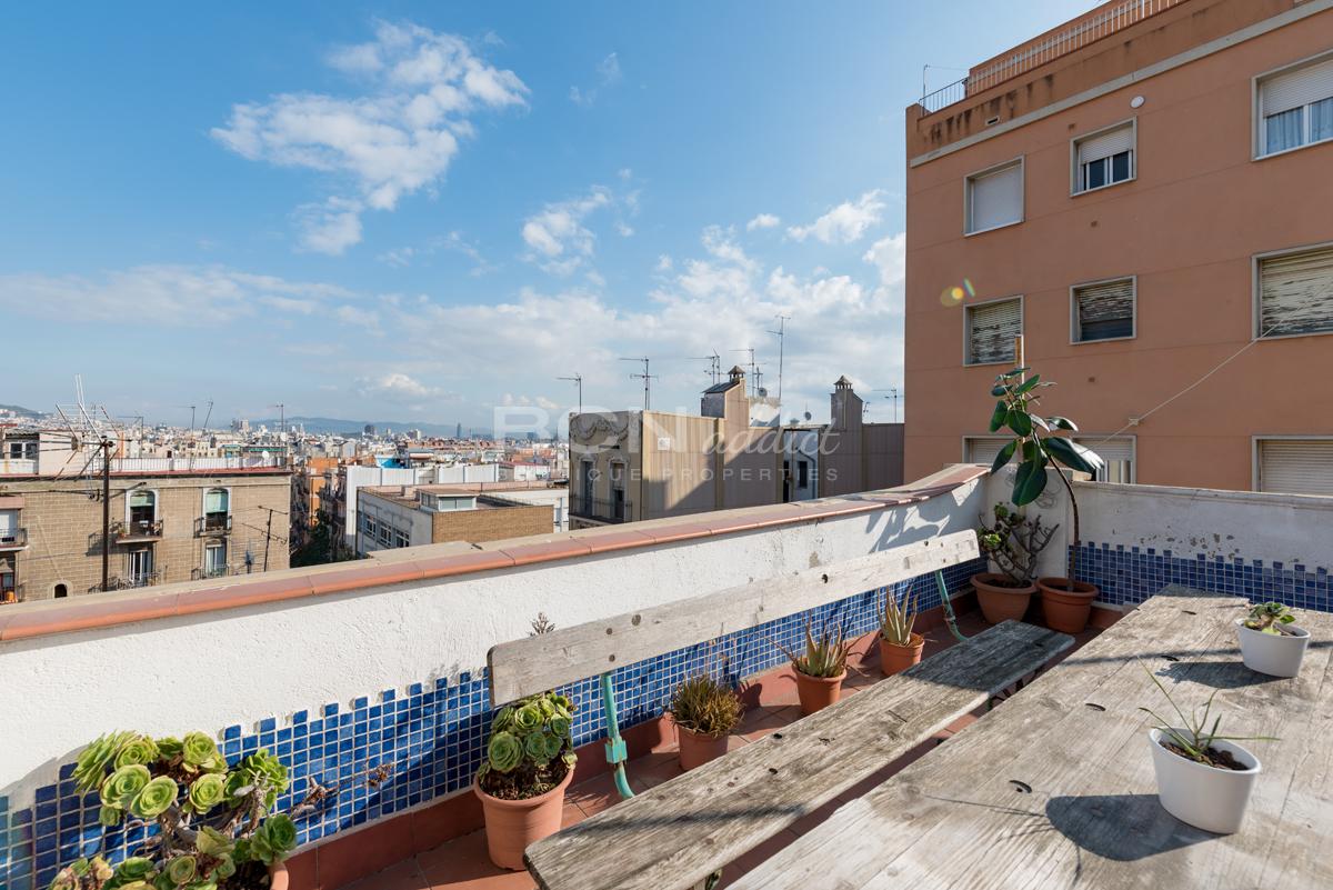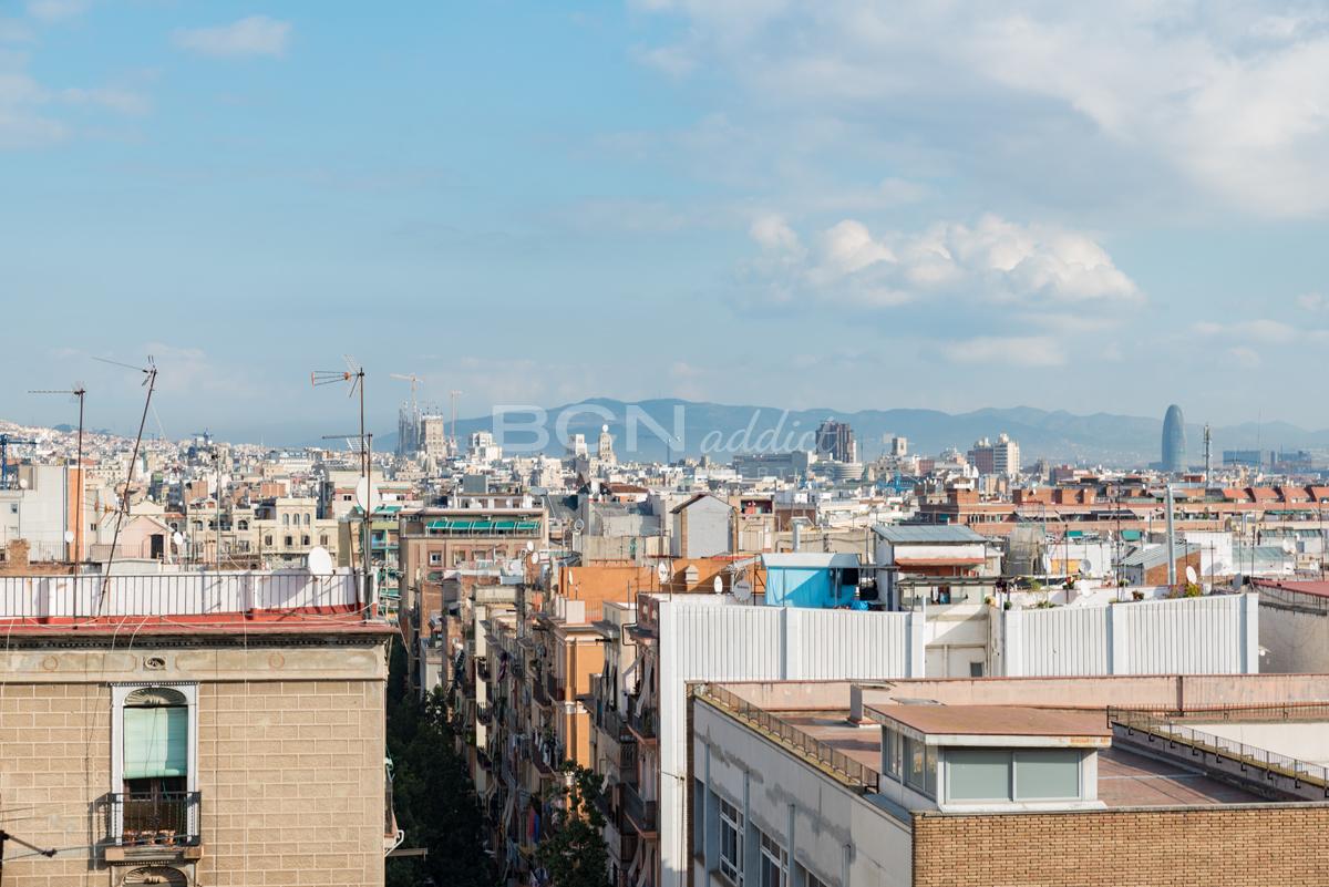 L'appartement dispose de deux portes fenêtres orientées sud-est donnant sur un grand balcon (6m2) avec vue imprenable sur la colline et les jardins de Montjuic. Il offre en plus une généreuse terrasse d'utilisation exclusive sur le toit (35 m2) avec vues panoramiques sur la ville de Barcelone.