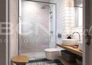 L'appartement est équipé de systèmes d'éclairage intégrés, d'un système de climatisation par conduit, d'une chaudière électrique pour l'eau chaude, de fenêtres à double vitrage, de meubles de salle de bain et de quelques appareils électroménagers dans la cuisine.