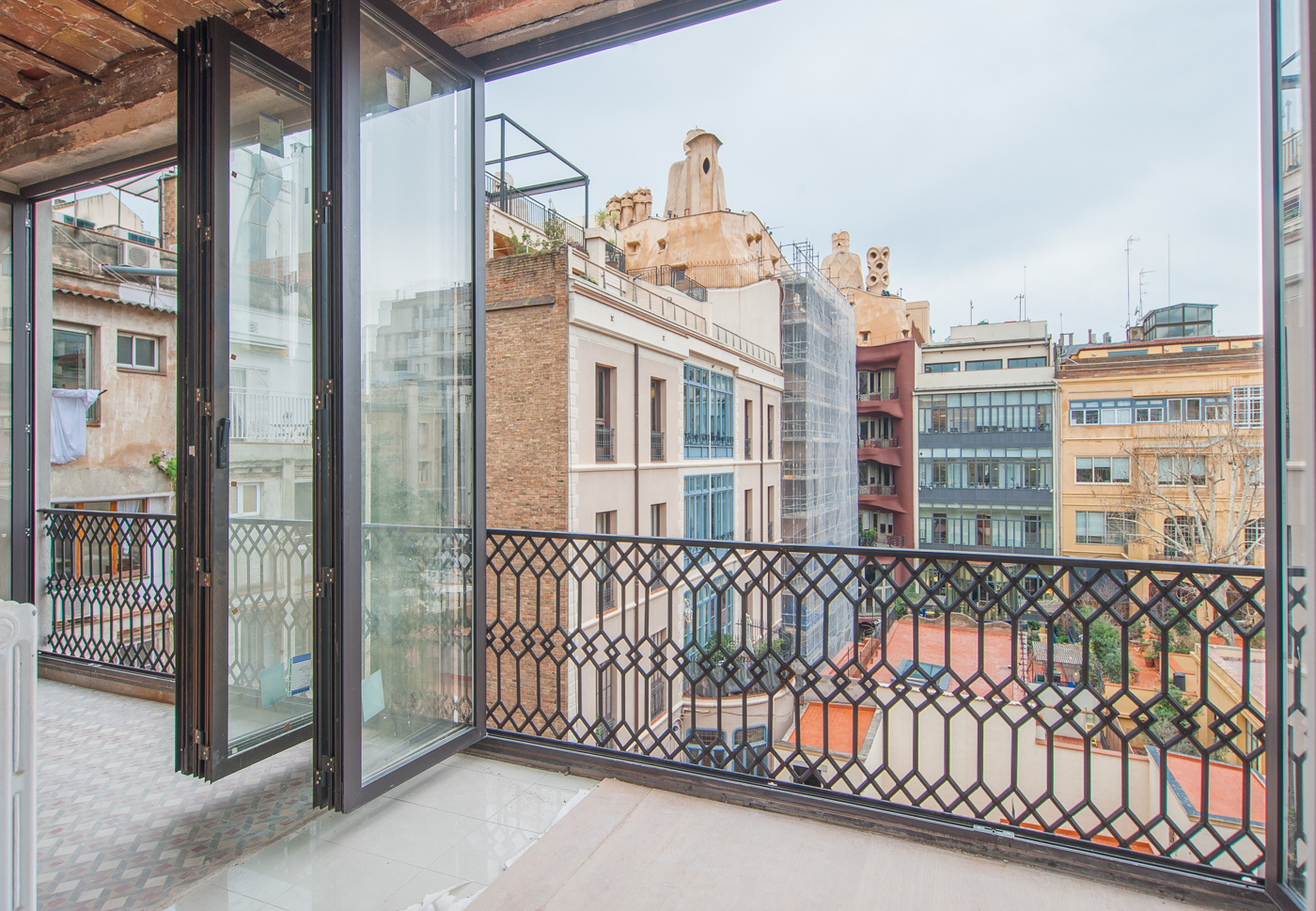 Cet appartement traversant au 4eme étage offre un intérieur lumineux et spacieux de 173 m2. L’appartement est à rénover entièrement et présente un bel espace de vie avec d’une part un côté ouvert Sud-Ouest sur la paisible cour intérieure paysagée avec vue sur le célèbre bâtiment moderniste La Pedrera et d’autre part un grand balcon avec deux larges portes-fenêtres avec orientation Nord-Este.