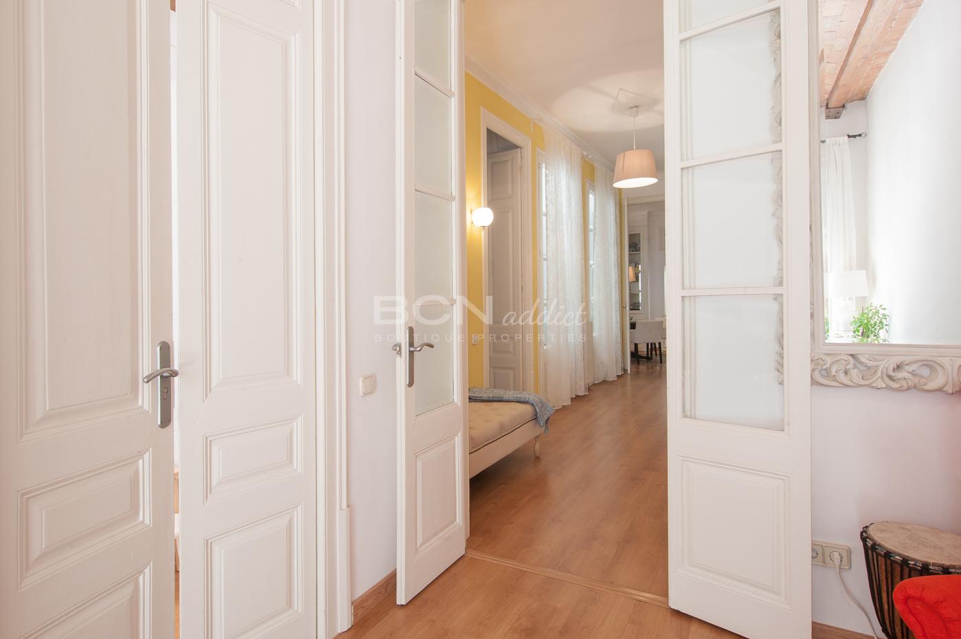 L'appartement traversant au troisième étage a été récemment rénové. Il dispose d'un intérieur moderne avec des finitions haut de gamme qui se combine parfaitement avec des éléments historiques d'une valeur architecturale tels que les plafonds avec rosette, plafond voûté en briques, cadre de portes en bois, sols hydrauliques ou balcons en fer forgé.