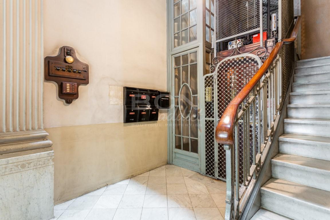 La structure du bâtiment, la façade et les communs sont en bon état. Le bâtiment bénéficie d'un ascenseur et dispose d'un hall de réception noble avec des éléments architectoniques tels que le sol en marbre, moulures, arches et colonnes. La magnifique façade présente des dessins, des moulures et des ornements autour des balcons en fer forgé.