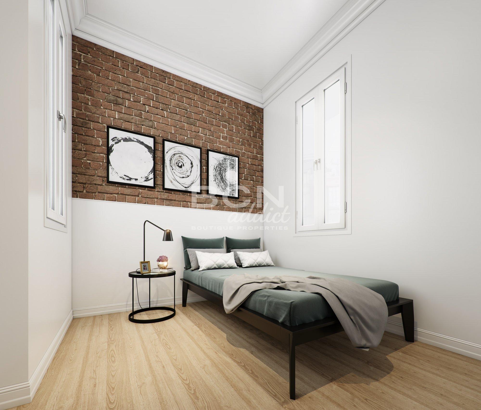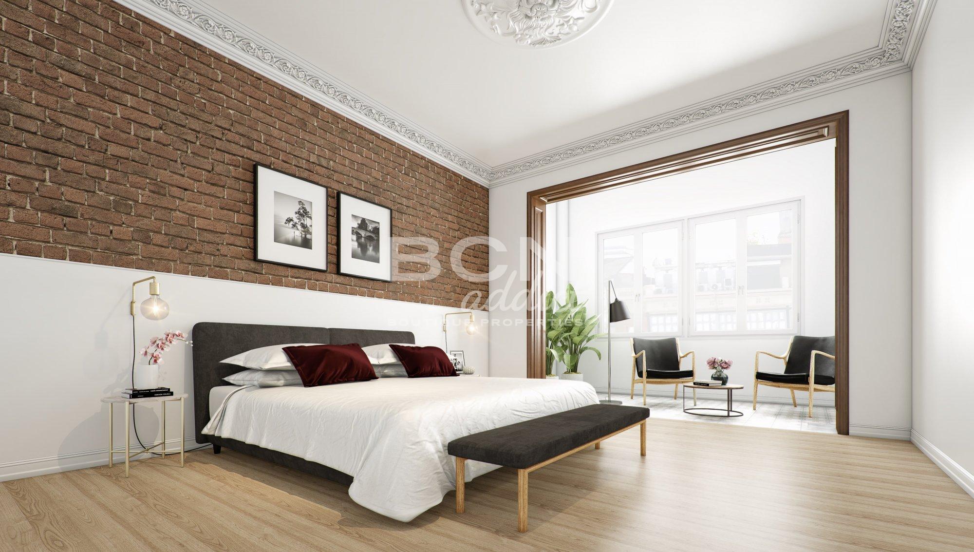 L'appartement associe des éléments historiques (moulures au plafond, menuiseries en bois, revêtements de sol hydrauliques, murs en briques apparentes ou plafonds voûtés catalans) à un intérieur moderne avec des matériaux haut de gamme.