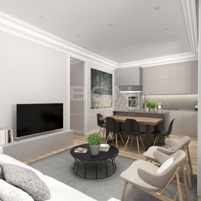 L'appartement est très ensoleillé grâce à sa hauteur dans le bâtiment et à son design intérieur moderne. L'appartement est prêt à emménager car il a récemment été entièrement rénové. La réforme inclut des matériaux haut de gamme et de nouvelles installations utilisant des marques bien connues.