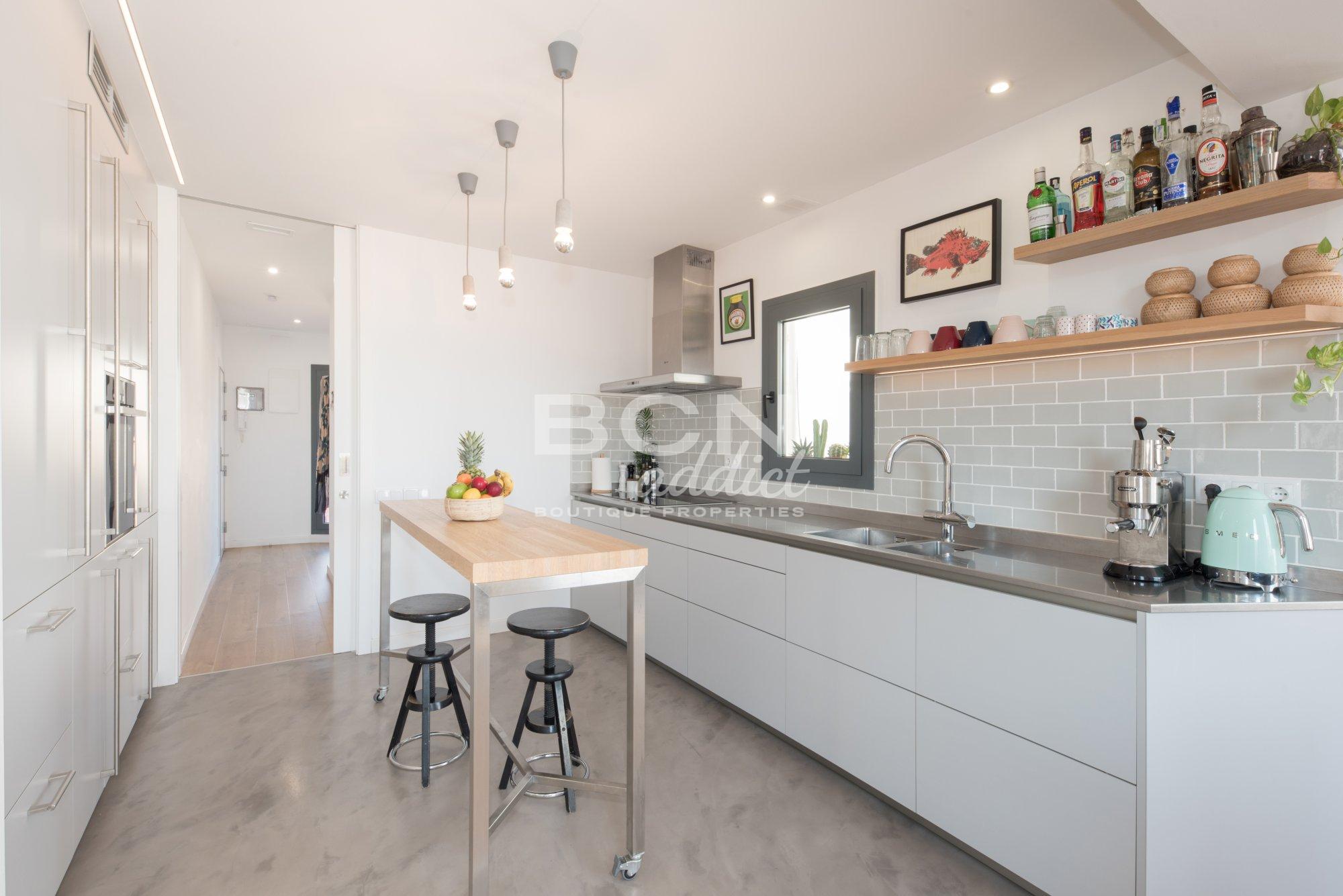 La cuisine, le salon et la salle à manger se combinent en une seule grande pièce qui offre un accès direct à une grande terrasse de 86 m2 de plain-pied, par une porte-fenêtre extra-large. L'espace extérieur orienté sud-est semble être une extension naturelle de l’appartement et offre une vue panoramique sur la ville, les espaces verts et la colline de Montjuic. La terrasse dispose d'un îlot de cuisine extérieure avec évier et plan de travail. En outre, il dispose de modules encastrés pour machine à laver et sèche-linge. Cette terrasse continue plus loin du côté de la chambre principale. Cependant, elle est séparée par un mur bas procurant une intimité supplémentaire à la suite principale.