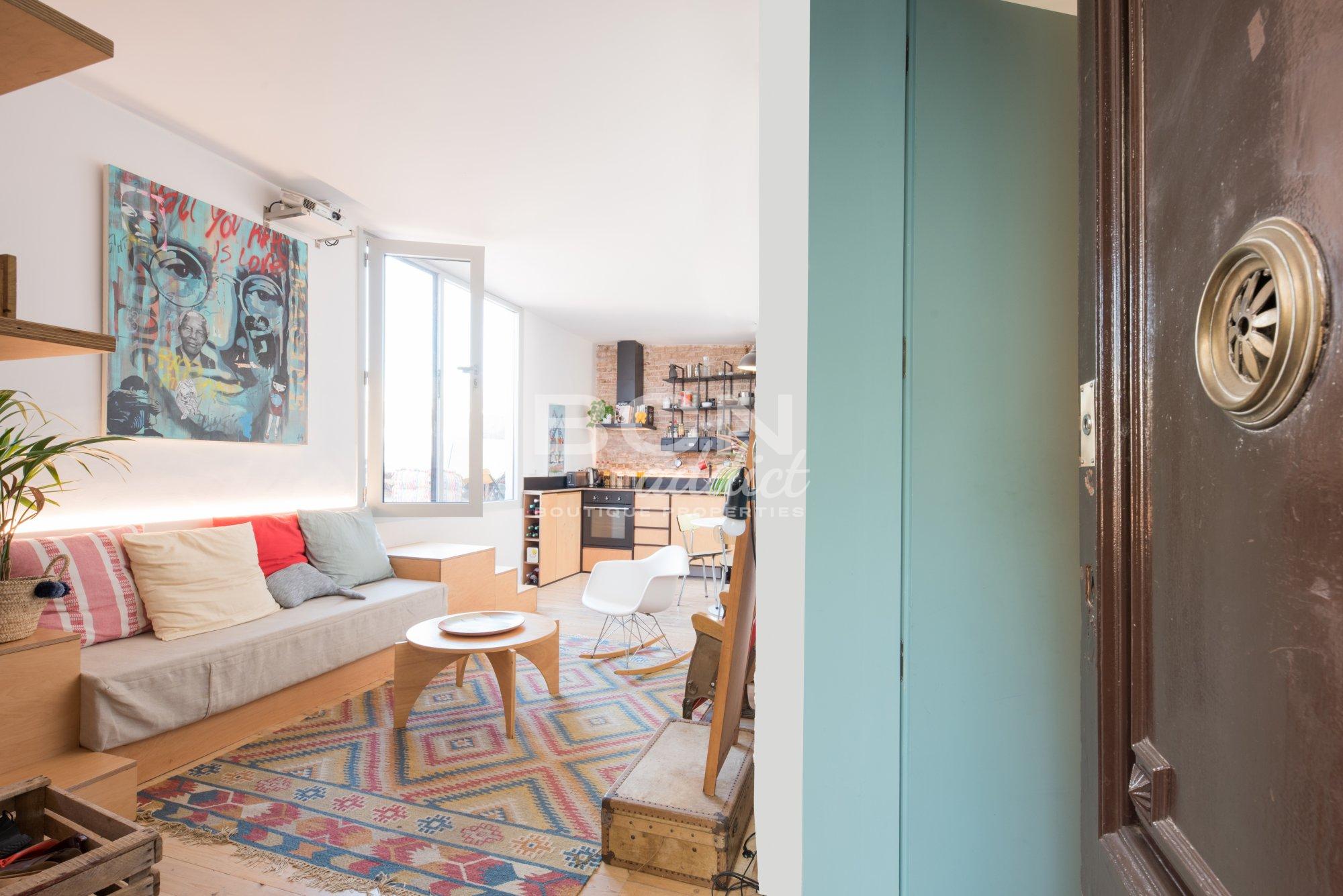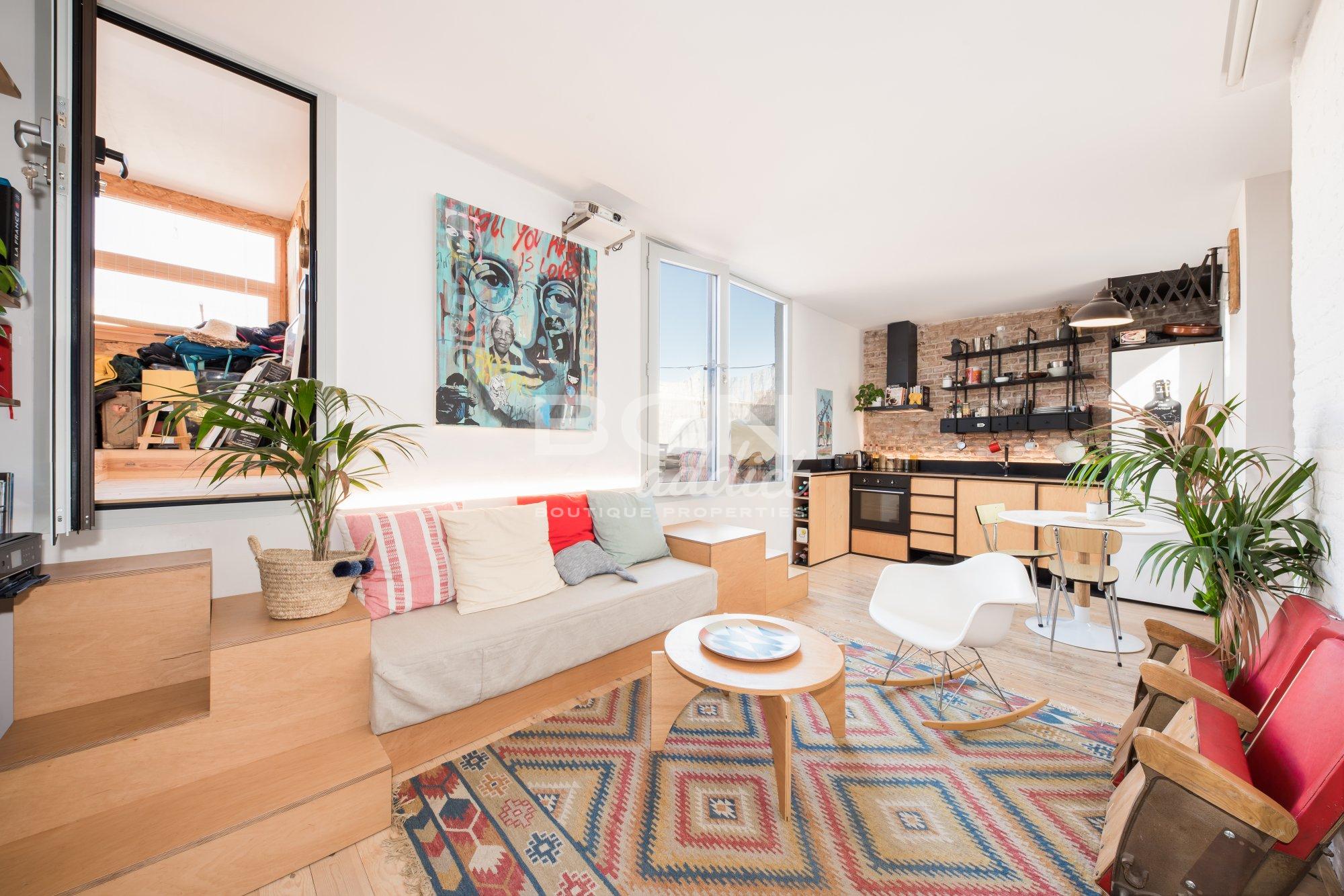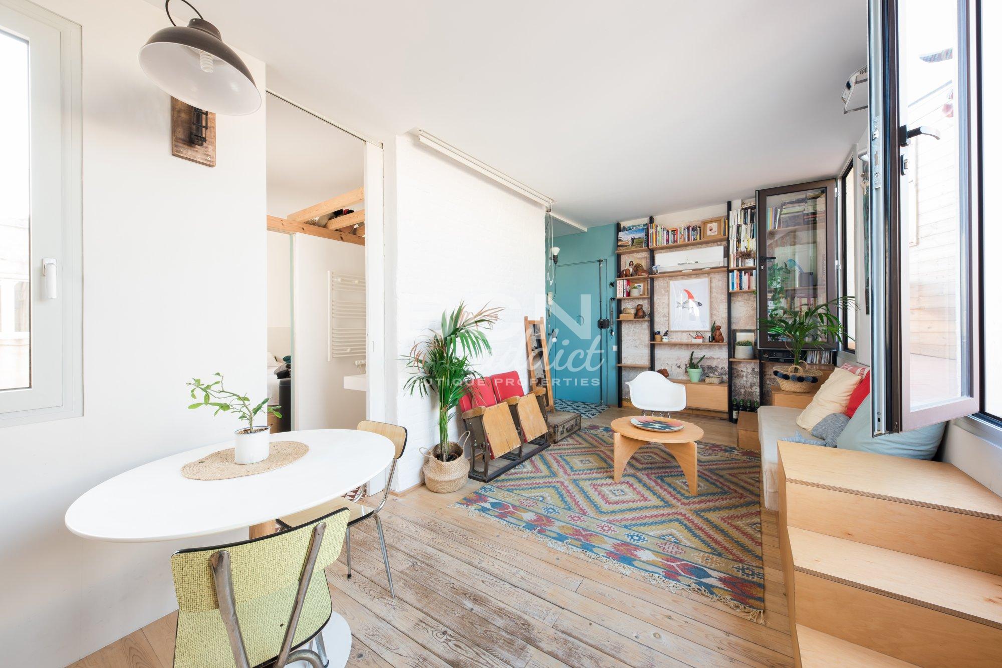 Le penthouse est en excellent état car il a été réformé il y a 3 ans. Ce charmant appartement situé au dernier étage combine des éléments d’origine, tels que des murs en briques apparentes, avec un design et des matériaux contemporains. La chambre à coucher, la salle de bain et la cuisine bénéficient de lumière naturelle puisqu'elles ont toutes des fenêtres sur le patio intérieur.