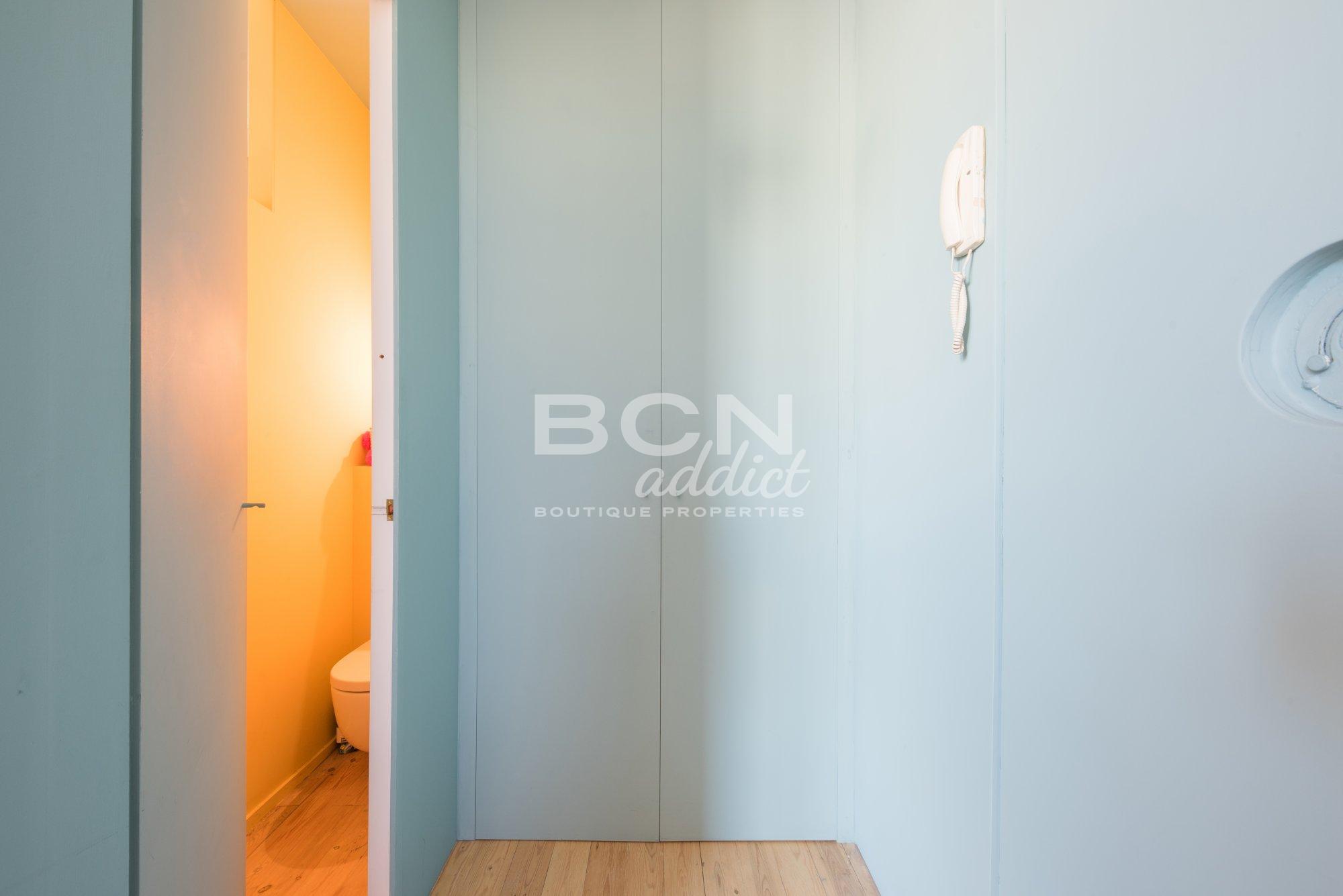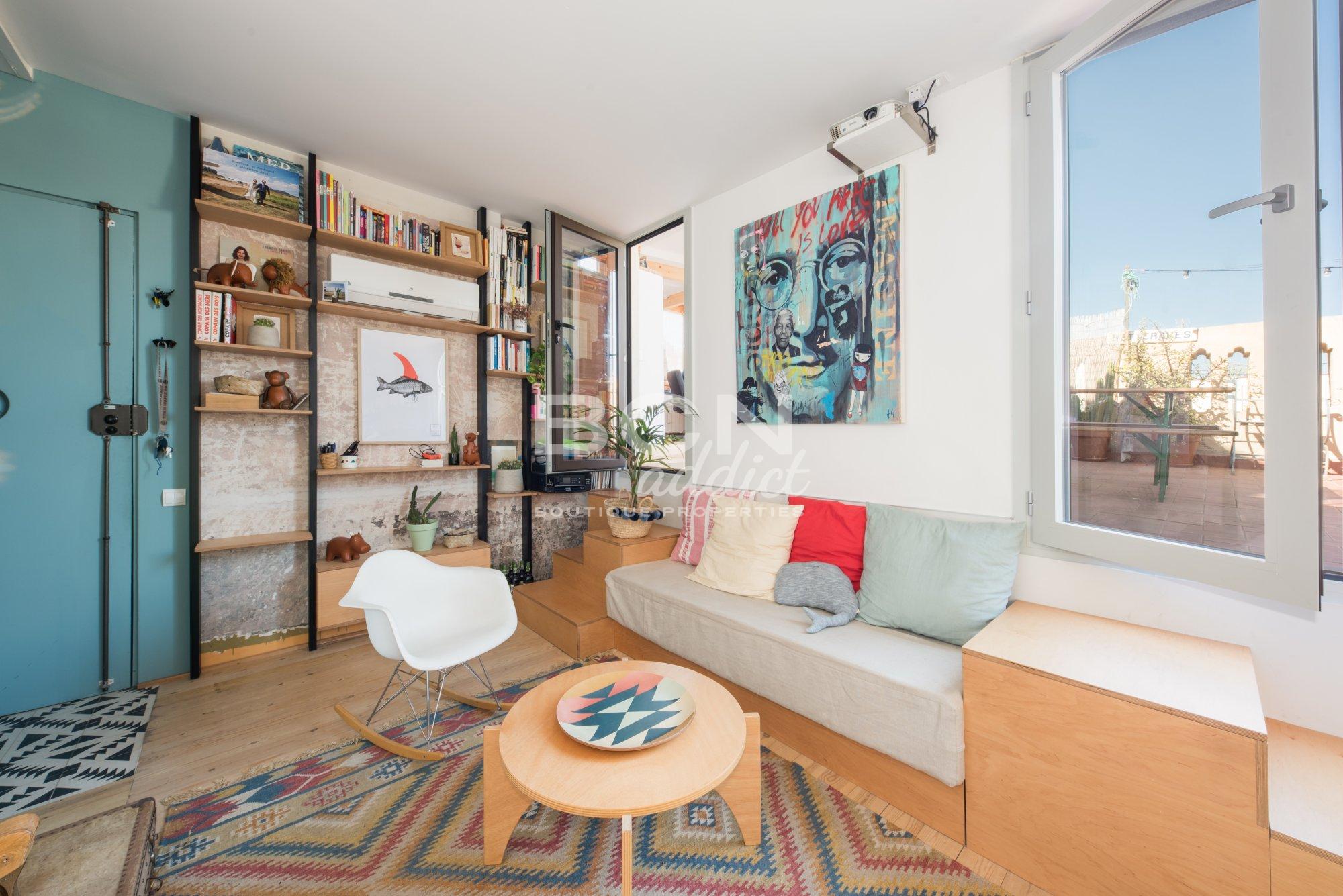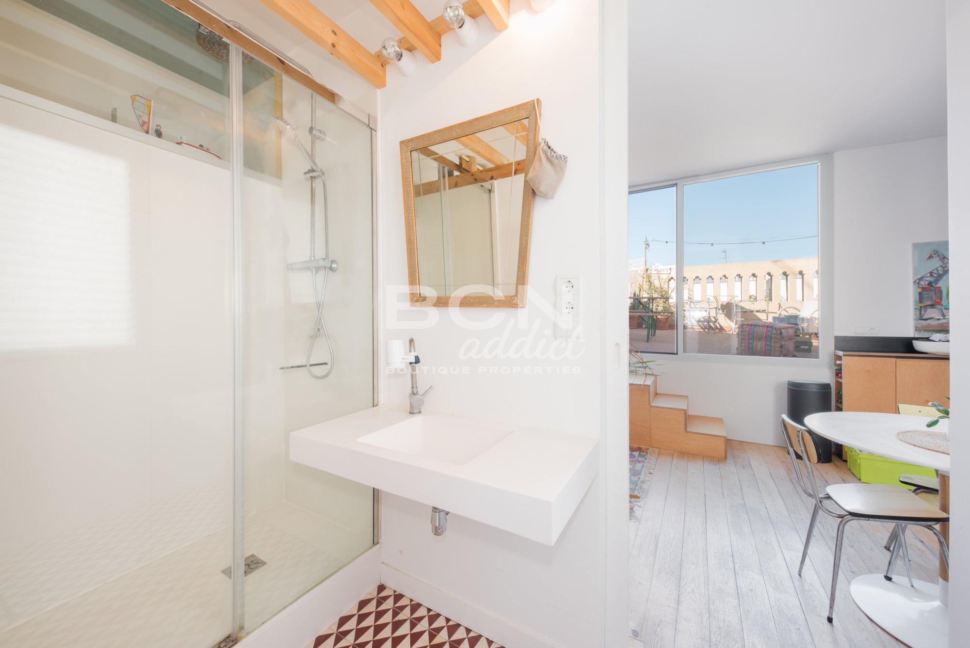 La propriété, de 45 m2 intérieurs construits, est située au cinquième et dernier étage du bâtiment. L’attique présente des espaces de vie lumineux avec de hauts plafonds et dispose d’éléments historiques visibles. Au même niveau que l’appartement, une superbe terrasse de 40 m2 à usage privé offre une vue panoramique sur la ville, le château de Ciudadela et les collines en second plan du Tibidabo. La surface extérieure comprend une cabane en bois de 10 m2 : elle dispose de plusieurs fenêtres, du chauffage, d’un point d’eau, de tuyaux de descente d’eau usée et de l´électricité. C'est un espace supplémentaire pour une utilisation multifonctionnelle.