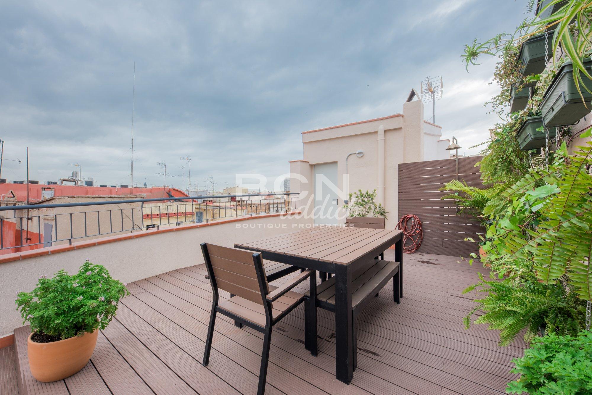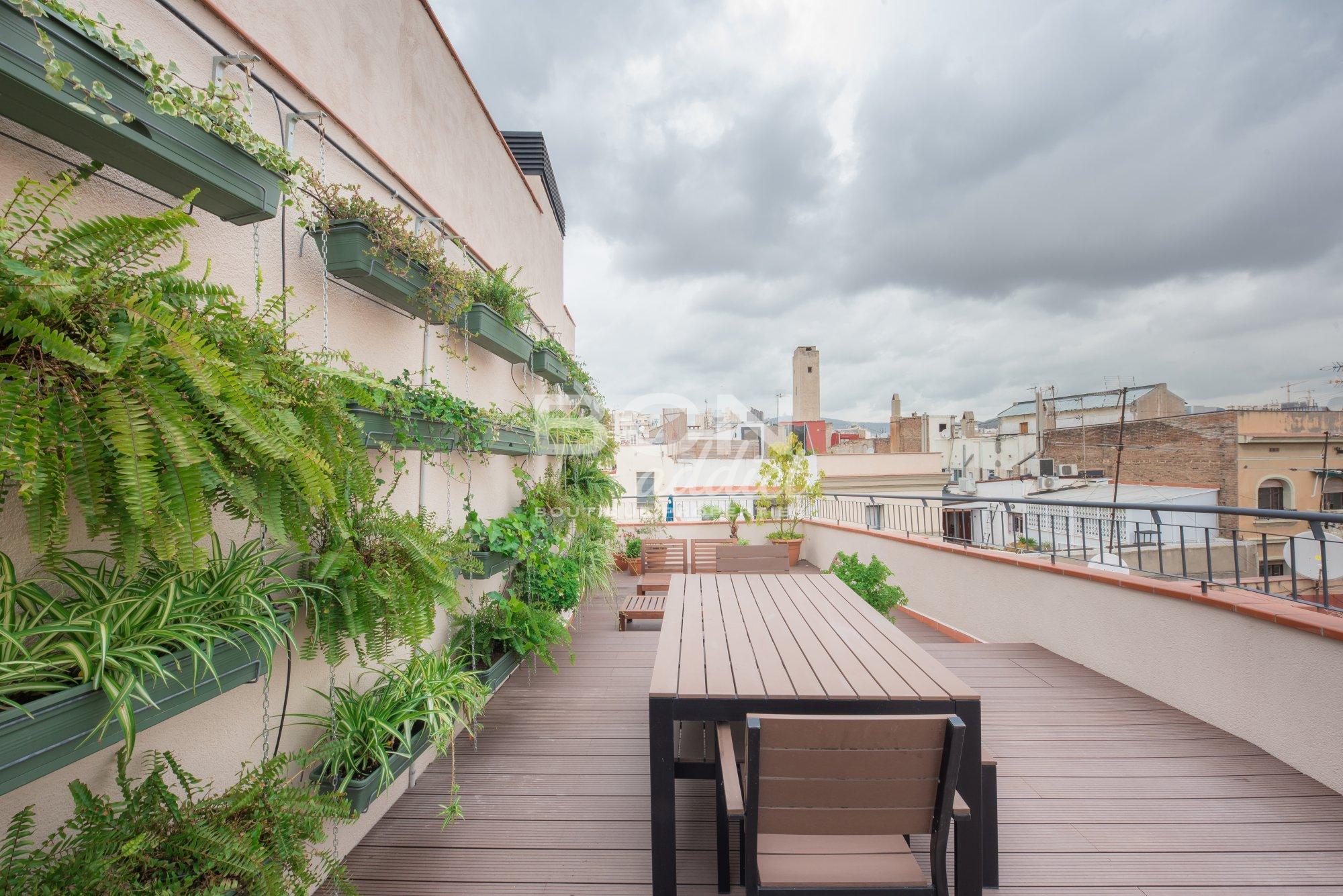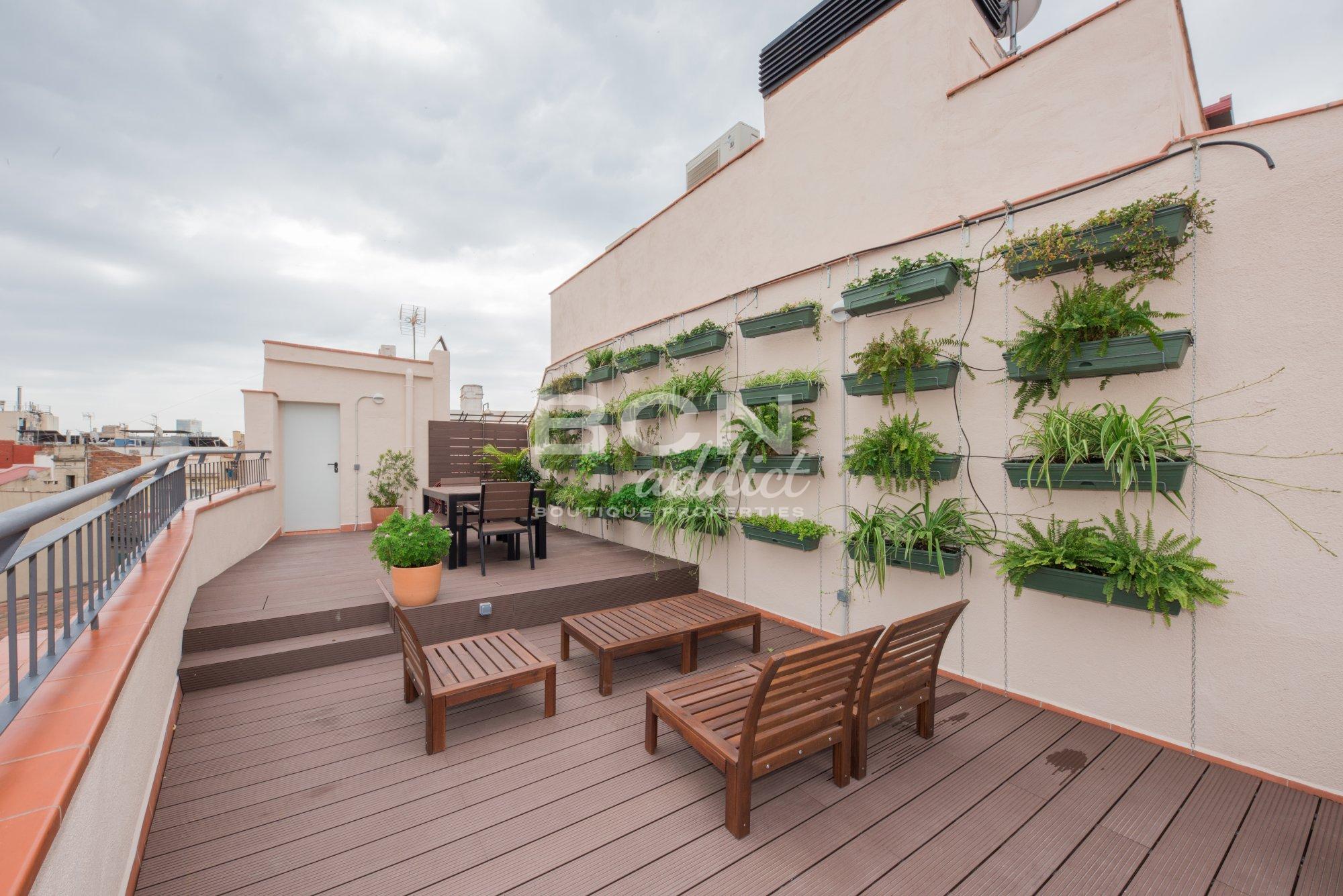 Une superbe terrasse privée de 40 m2 au-dessus de l'appartement offre une vue panoramique sur la ville et les collines du Tibidabo en toile de fond. La surface extérieure aménagée comprend jardin vertical, douche, sol de caillebotis, mobilier d'exterieur (chaise et table basse), descente d'eau usée, robinet d'eau et accès à l'électricité. C'est un espace appréciable pour une utilisation multifonctionnelle.
