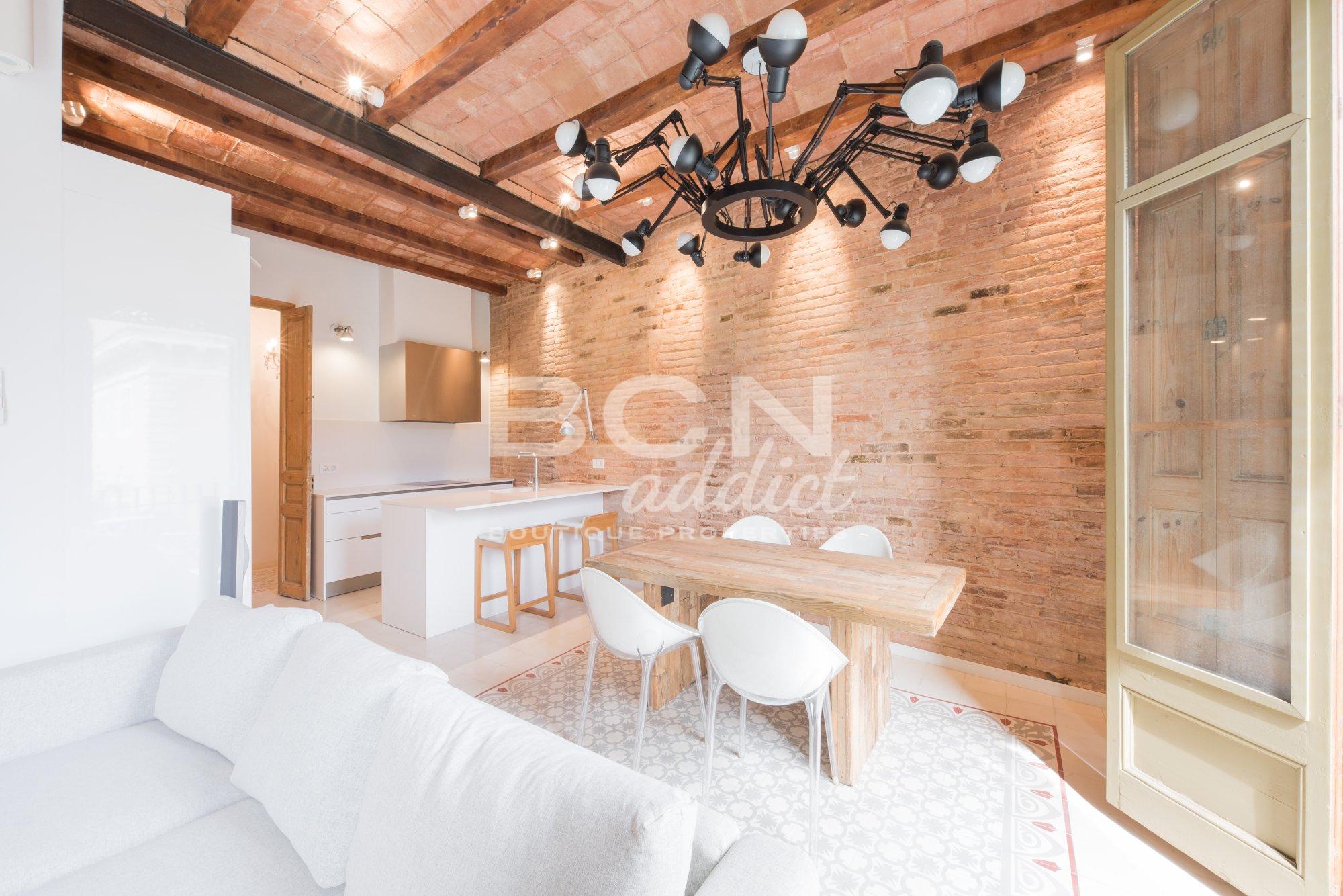 La propriété de 92 m2 a été entièrement rénovée en 2014 et associe des éléments historiques (carrelage hydraulique authentique, huisserie originale, murs en briques apparentes et plafonds voûtés catalans en brique) à des intérieurs modernes et des matériaux haut de gamme de marques renommées. L'appartement est équipé de plusieurs systèmes d'éclairage avec variateurs encastrés ou visibles, de la climatisation avec 2 splits double fonction froid chaud, chaudière à gaz pour eau chaude et radiateurs, fenêtres à double vitrage ou meubles de cuisine et îlot central sur mesure encastrés avec appareils électroménagers.