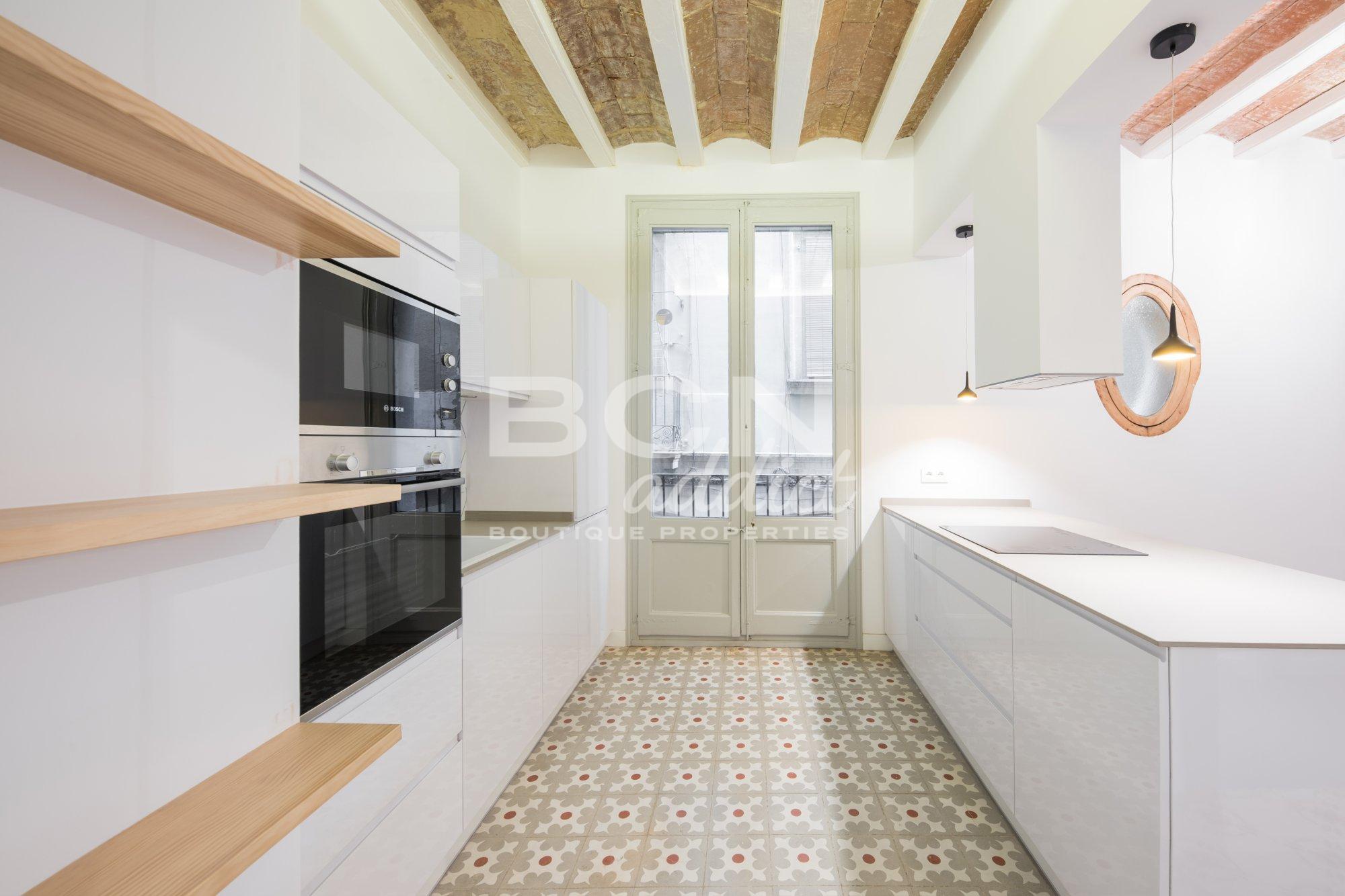L'appartement associe des caractéristiques d'origine (sol hydraulique, menuiserie authentique, murs en briques apparentes, plafond voûté en briques ou poutres apparentes) à un intérieur moderne avec des matériaux de qualité de marques connues.