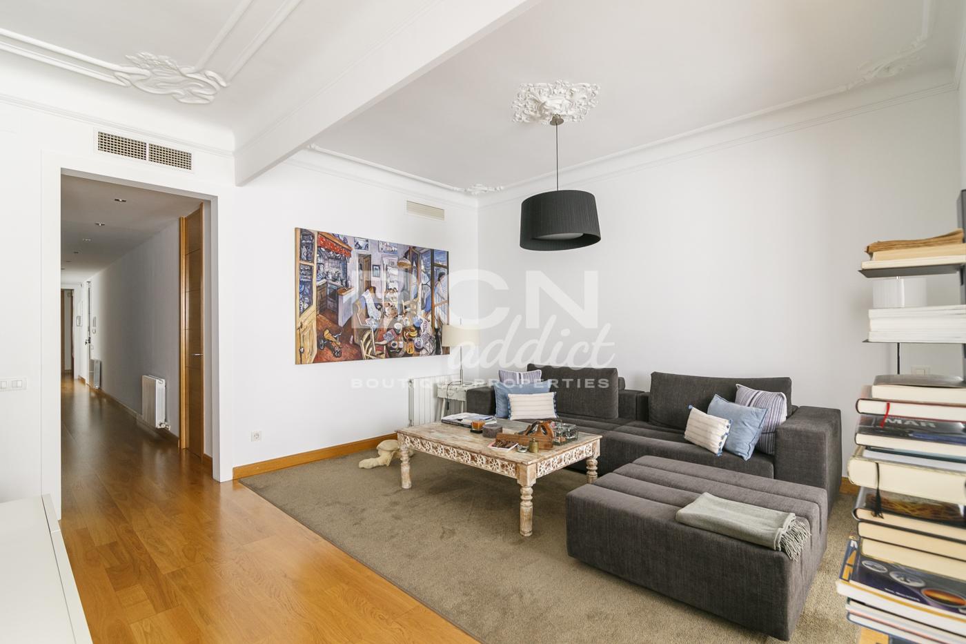 Este piso combina techos altos decorados con molduras y rosetones, diseño moderno, pavimento de parquet natural y carpintería interior de madera.
