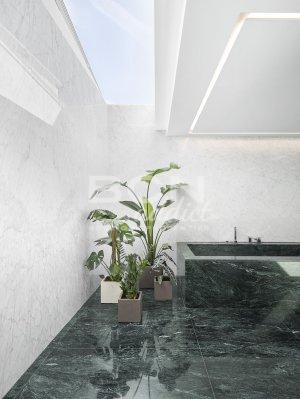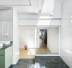 Le principal élément qui traverse l’appartement est l’exposition à la lumière naturelle du soleil. De la terrasse orientée à l’est, du salon et de la cuisine à la terrasse orientée à l’ouest, à la salle de bain et à la chambre principale, la lumière naturelle du soleil se propage du lever au coucher du soleil. Dans chaque partie de cet appartement, les éléments forts de la vie se reflètent, des parquets en chêne qui unissent les différents éléments, aux terrasses en grès martelé, au cadre rouge qui semble être enveloppé et plongé dans le marbre vert, et la salle de bain principale qui semble reproduire une « végétation » intérieure sous le grand puit de lumière du Velux, reflétant la nature et créant une atmosphère chaleureuse et calme.