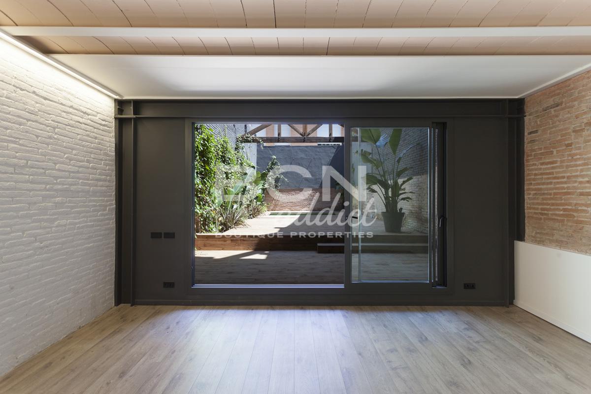 En una tranquila calle peatonal del barrio de Provençals del Poblenou, frente a la antigua fábrica de ladrillo donde hoy se ubica la universidad, se encuentra este precioso edificio con fachada de ladrillo visto, madera y vidrio que nos recuerda el pasado industrial del barrio.