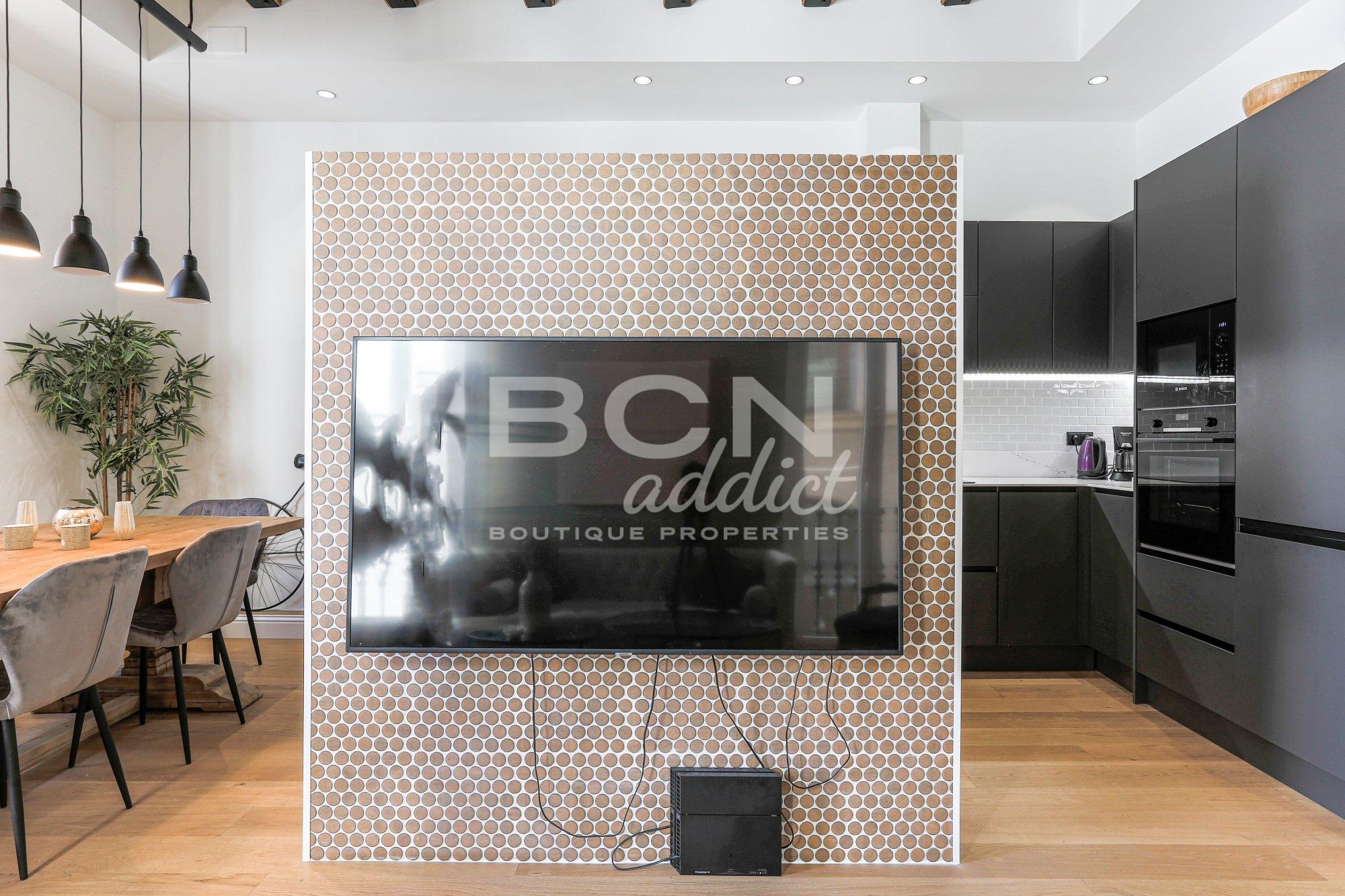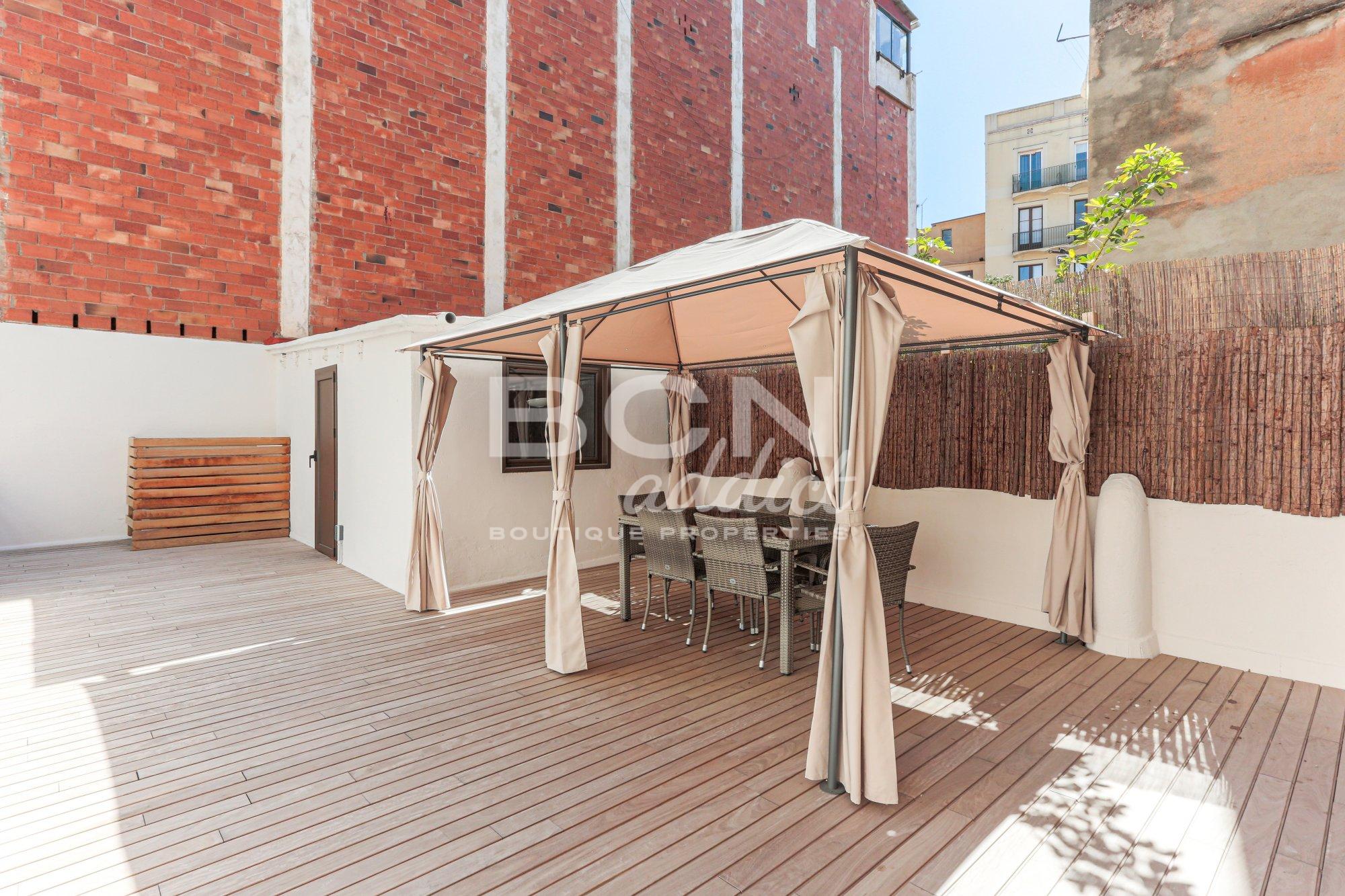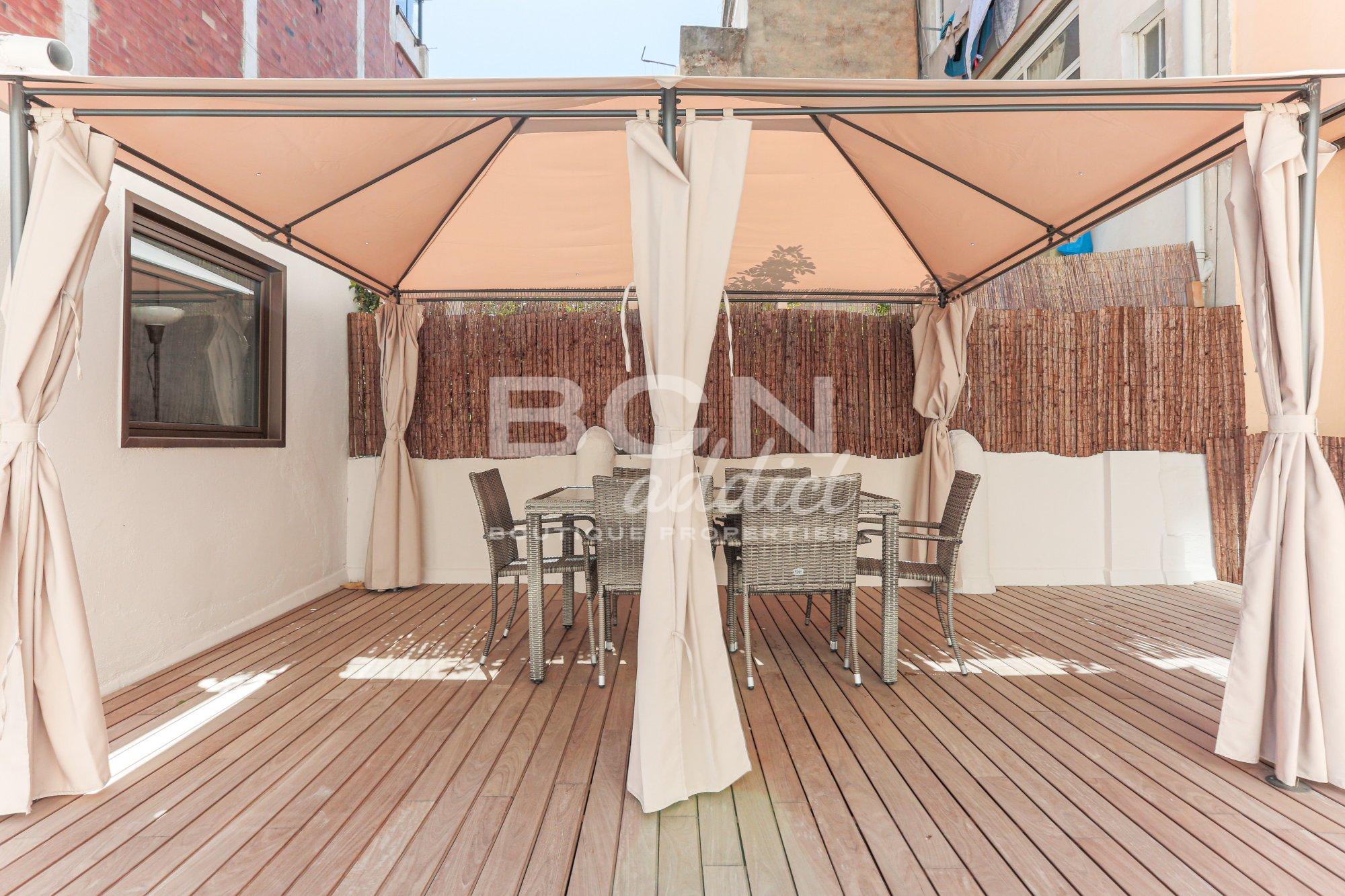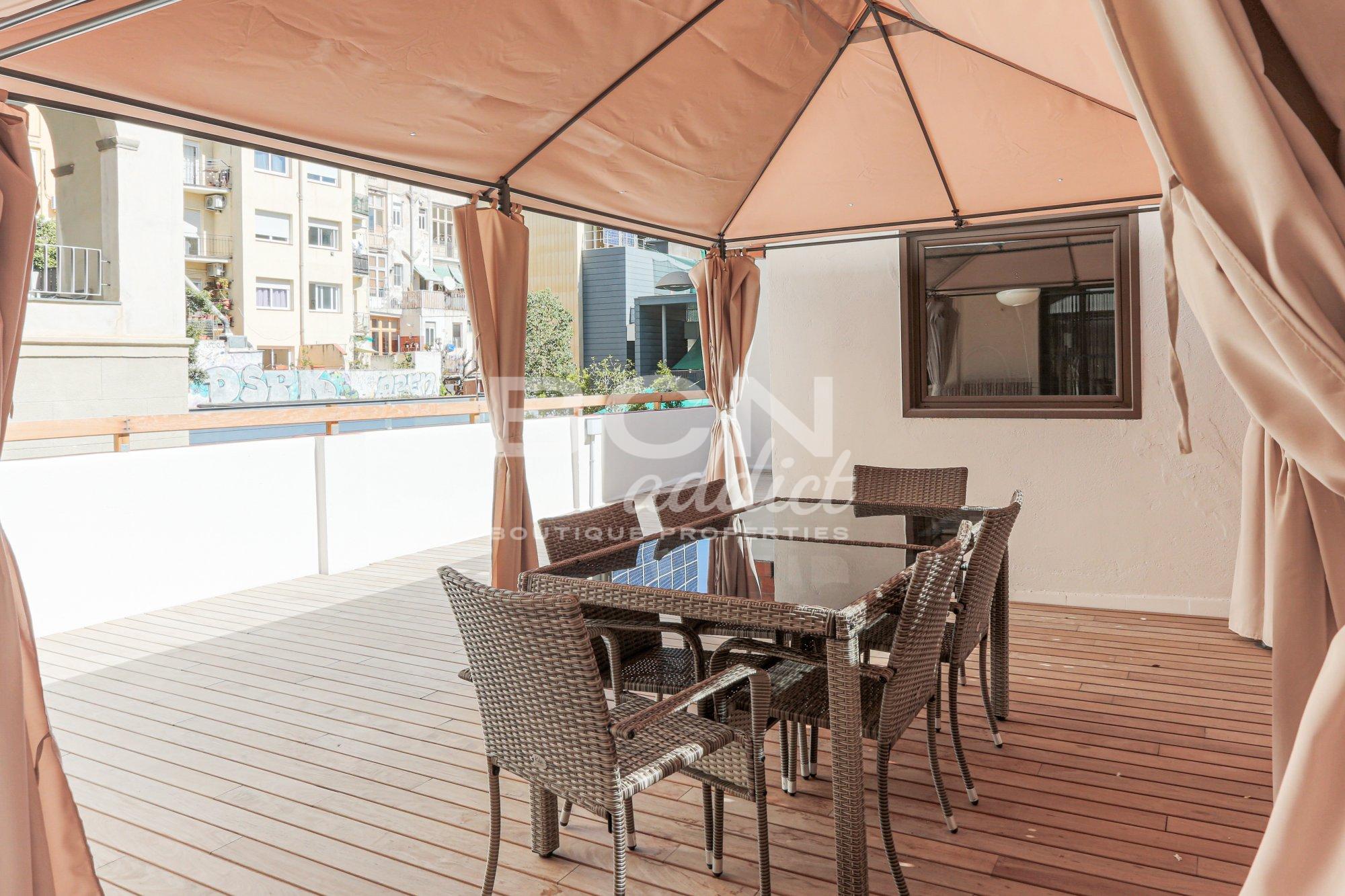 Très lumineux cet appartement de 115 m2, entièrement rénové dans la tendance actuelle, dispose d'un grand atout : une vaste terrasse de 45 m2 pour apprécier pleinement la vie barcelonaise et son soleil omniprésent. Au premier étage d'un immeuble de 1936, il est situé dans une rue calme semi-piétonne. La rénovation permet de profiter au maximum d'un intérieur doté de tout le confort moderne - air conditionné intégré, chauffage au gaz naturel, éclairage Leds intégrés- dans un style très local avec notamment l'authentique plafond en voûte catalane en briques et poutres de bois apparentes parfaitement mis en valeur. L'agencement du plan très fonctionnel sépare nettement la zone de nuit et la zone de jour de part et d'autre de l'entrée. La zone de jour se compose d'une vaste pièce de 33 m2 baignée de lumière naturelle grâce à quatre ouvertures dont trois portes-fenêtres. La cuisine ouverte est subtilement séparée du salon-salle-à-manger par une élégante cloison à mi-hauteur.