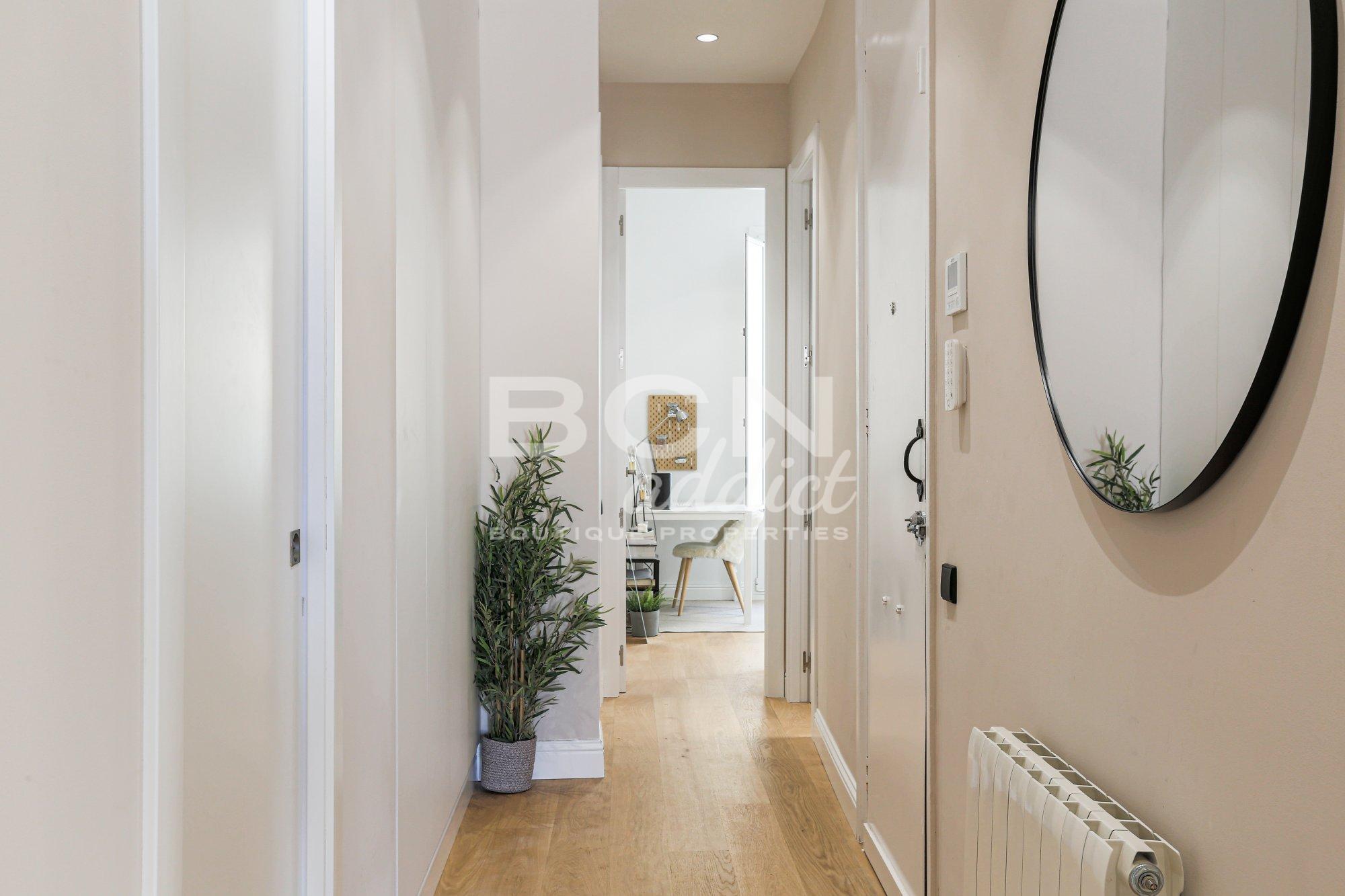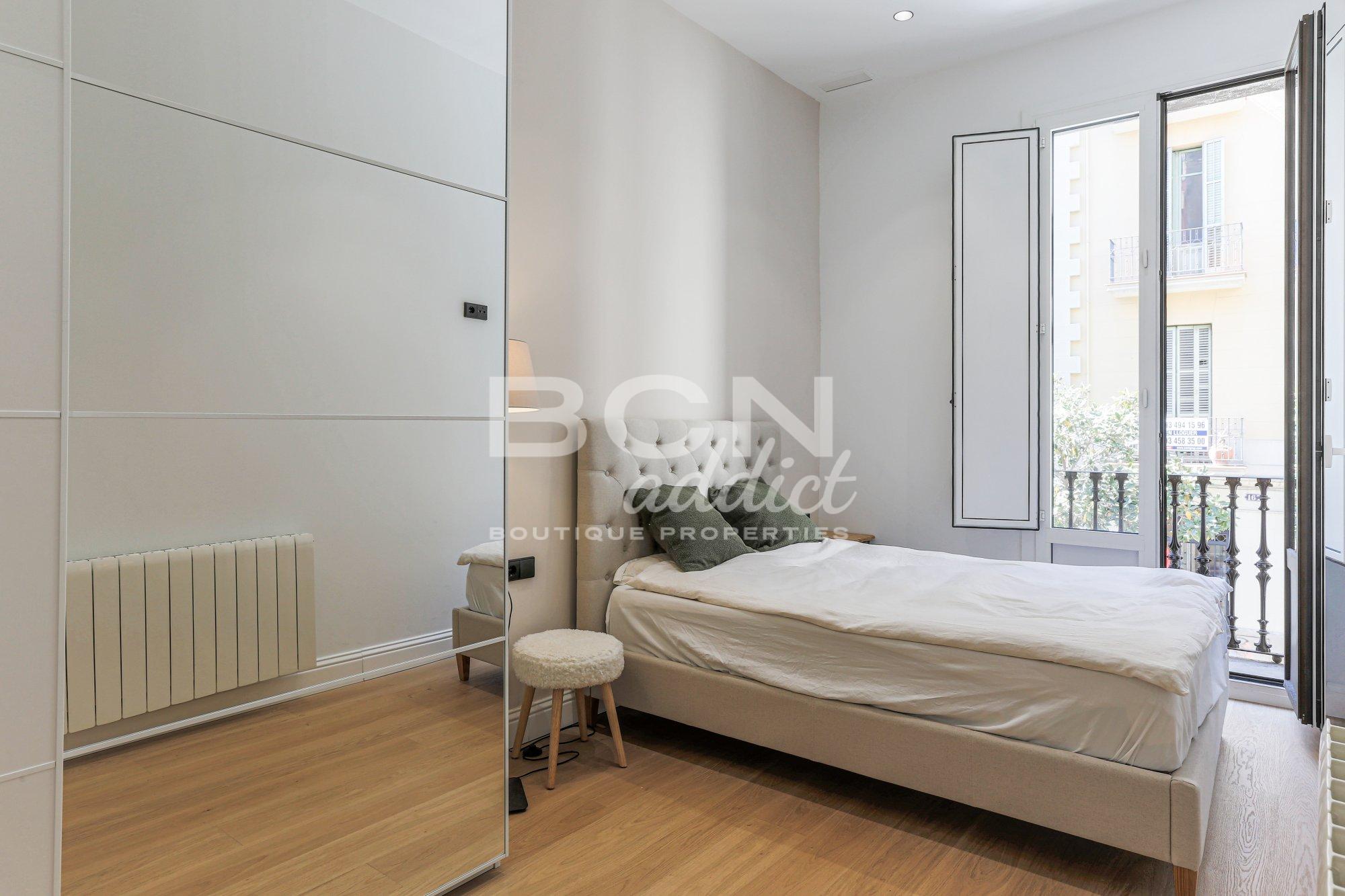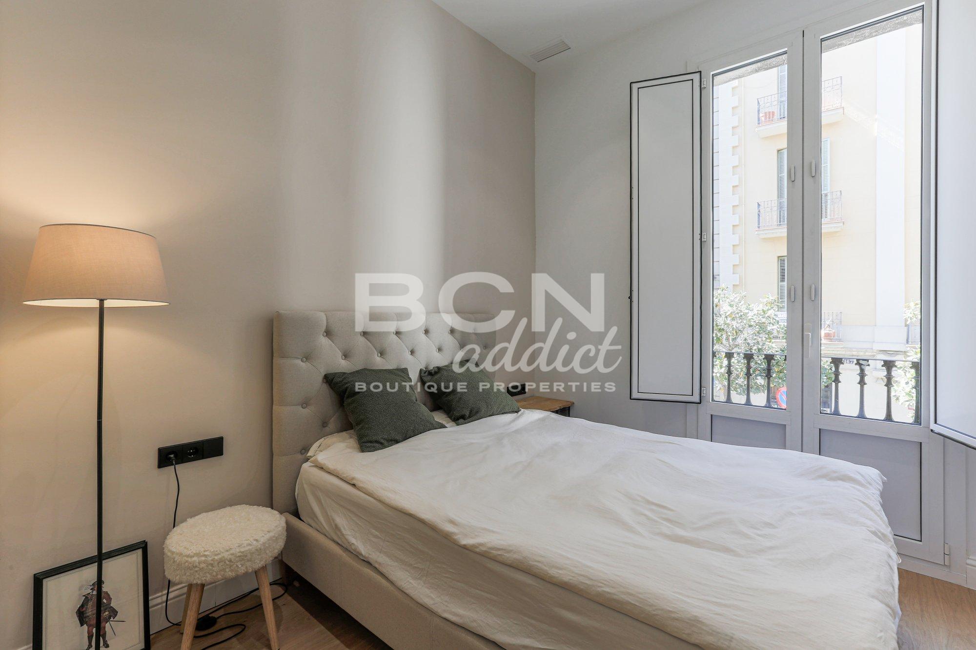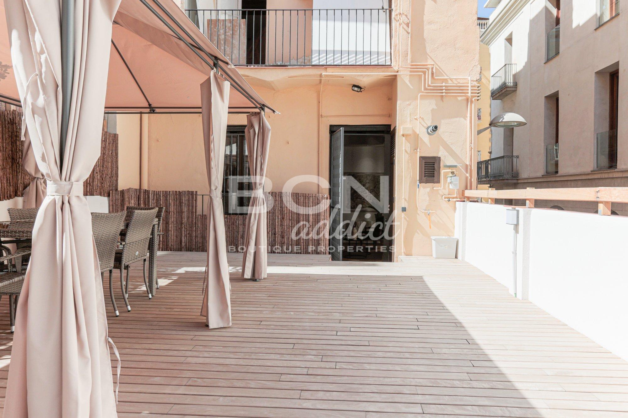 Très lumineux cet appartement de 115 m2, entièrement rénové dans la tendance actuelle, dispose d'un grand atout : une vaste terrasse de 45 m2 pour apprécier pleinement la vie barcelonaise et son soleil omniprésent. Au premier étage d'un immeuble de 1936, il est situé dans une rue calme semi-piétonne. La rénovation permet de profiter au maximum d'un intérieur doté de tout le confort moderne - air conditionné intégré, chauffage au gaz naturel, éclairage Leds intégrés- dans un style très local avec notamment l'authentique plafond en voûte catalane en briques et poutres de bois apparentes parfaitement mis en valeur. L'agencement du plan très fonctionnel sépare nettement la zone de nuit et la zone de jour de part et d'autre de l'entrée. La zone de jour se compose d'une vaste pièce de 33 m2 baignée de lumière naturelle grâce à quatre ouvertures dont trois portes-fenêtres. La cuisine ouverte est subtilement séparée du salon-salle-à-manger par une élégante cloison à mi-hauteur.
