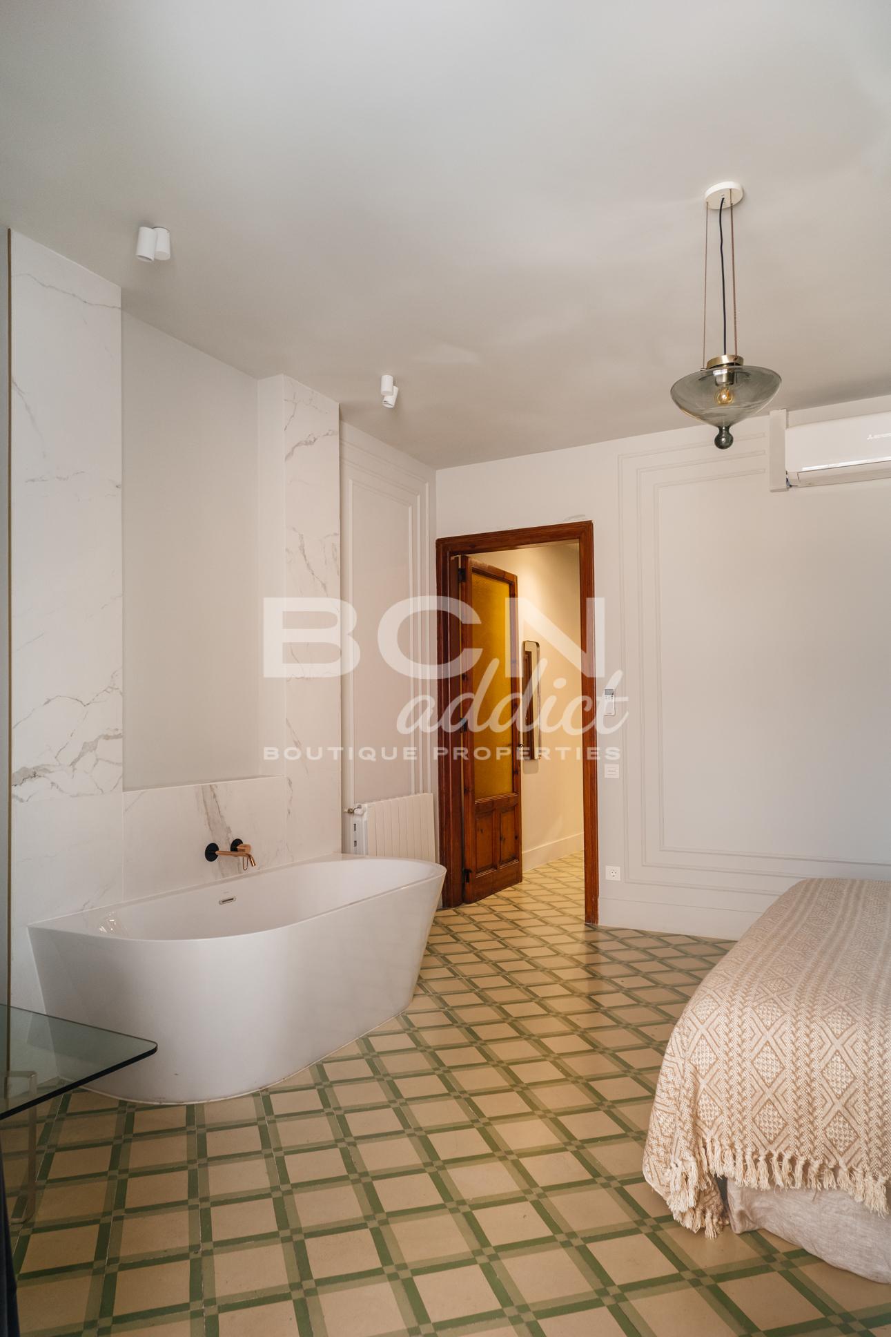 Cet appartement situé au deuxième étage offre 123 m², soigneusement conçu pour combiner la fonctionnalité moderne avec l'élégance intemporelle de l'architecture d'origine. La disposition comprend deux chambres et une suite parentale de 30 m², qui dispose d'une galerie privée avec de grandes fenêtres inondant l'espace de lumière naturelle. Dans cette zone, vous trouverez une salle de bain magnifiquement conçue avec une douche, offrant une combinaison harmonieuse de style et de confort.
