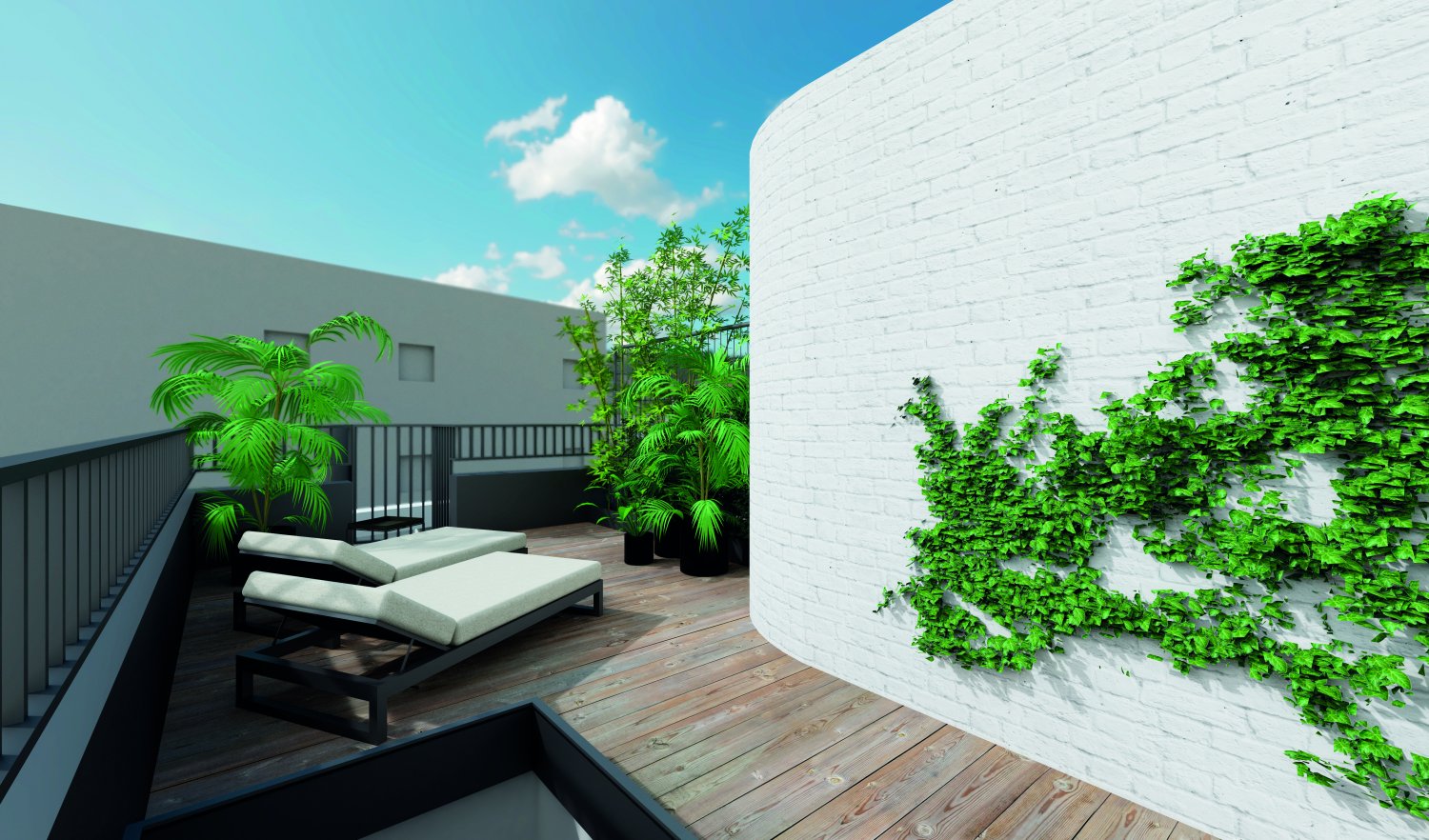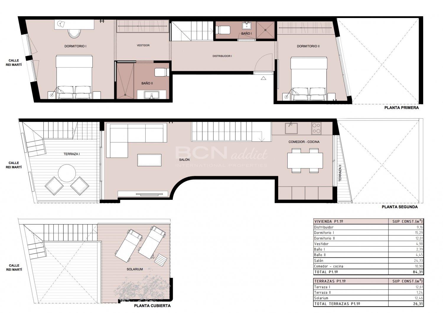 Duplex de 84,31 m2 con 26m2 de terrazas. En la primera planta encontramos dos dormitorios dobles, uno de tipo suite con baño completo y “walk-in closet” y el otro con armario empotrado. Así que un segundo baño completo. En la segunda planta encontramos por un lado el largo comedor-cocina con cristaleras que dan a una pequeña terraza y al otro lado el salón de 24,73 m2 con cristaleras que dan a una terraza de 12,61 m2. desde esta terraza hay escaleras para subir al solarium de 12,46 m2 en el techo.