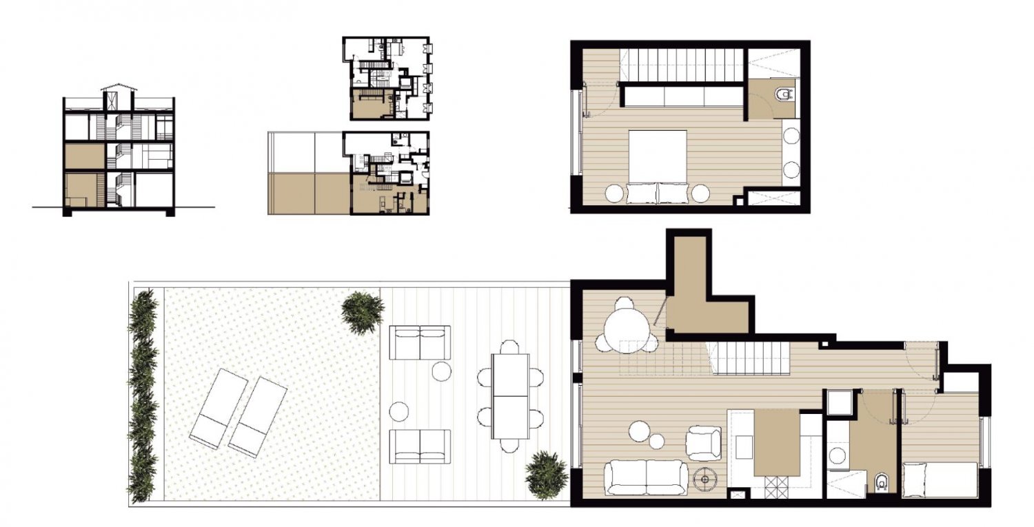 En la planta baja tenemos dos viviendas dúplex con un excelente jardín de más de 60m2. Por otra parte, en la planta primera y segunda, tenemos las tres viviendas restantes que tienen asignado cada una de ellas, una terraza en la cubierta de aproximadamente 25m2 para disfrutar del excelente clima de Barcelona.