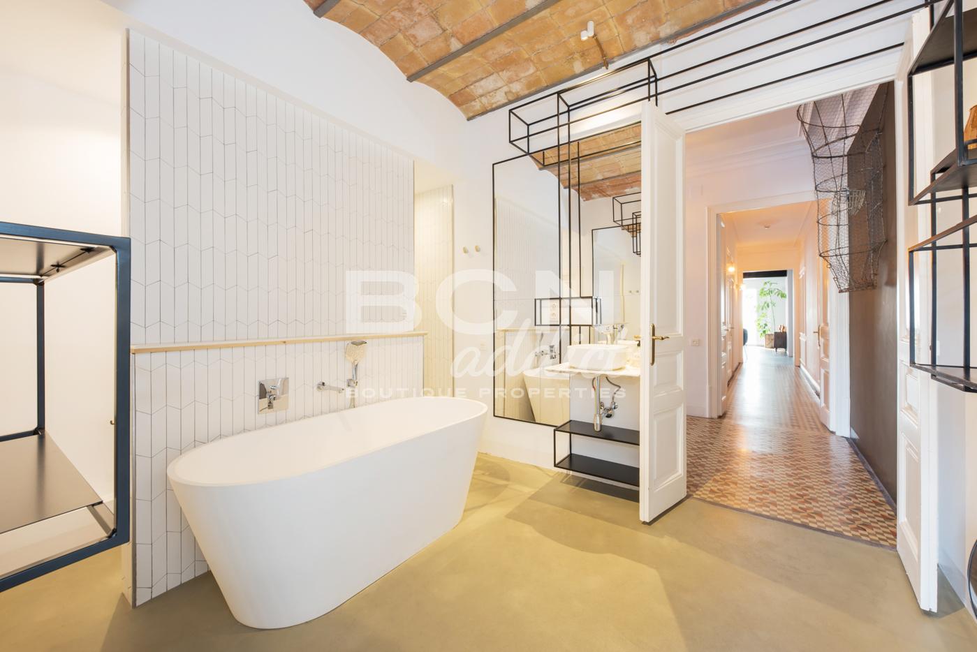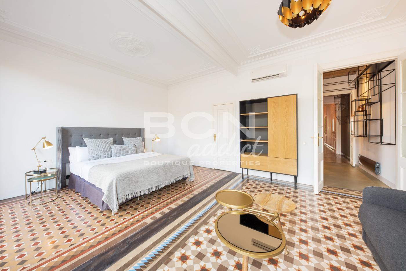 La propiedad a dos vientos de 137 metros cuadrados se encuentra en el último piso de una emblemática calle peatonal en Eixample. El ático goza de mucha luz natural todo el día: el piso tiene 2 grandes puertas ventanas en el dormitorio principal y una galería en el comedor.