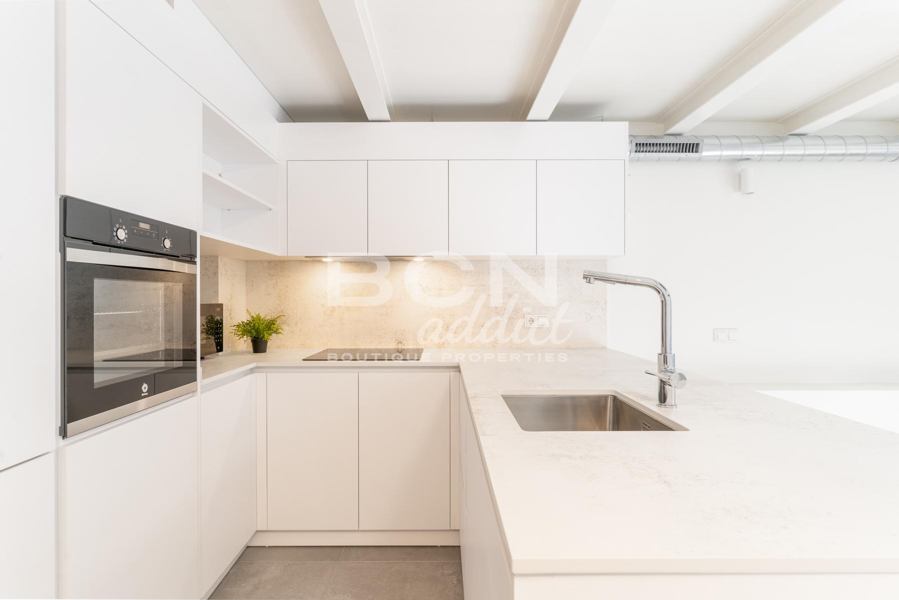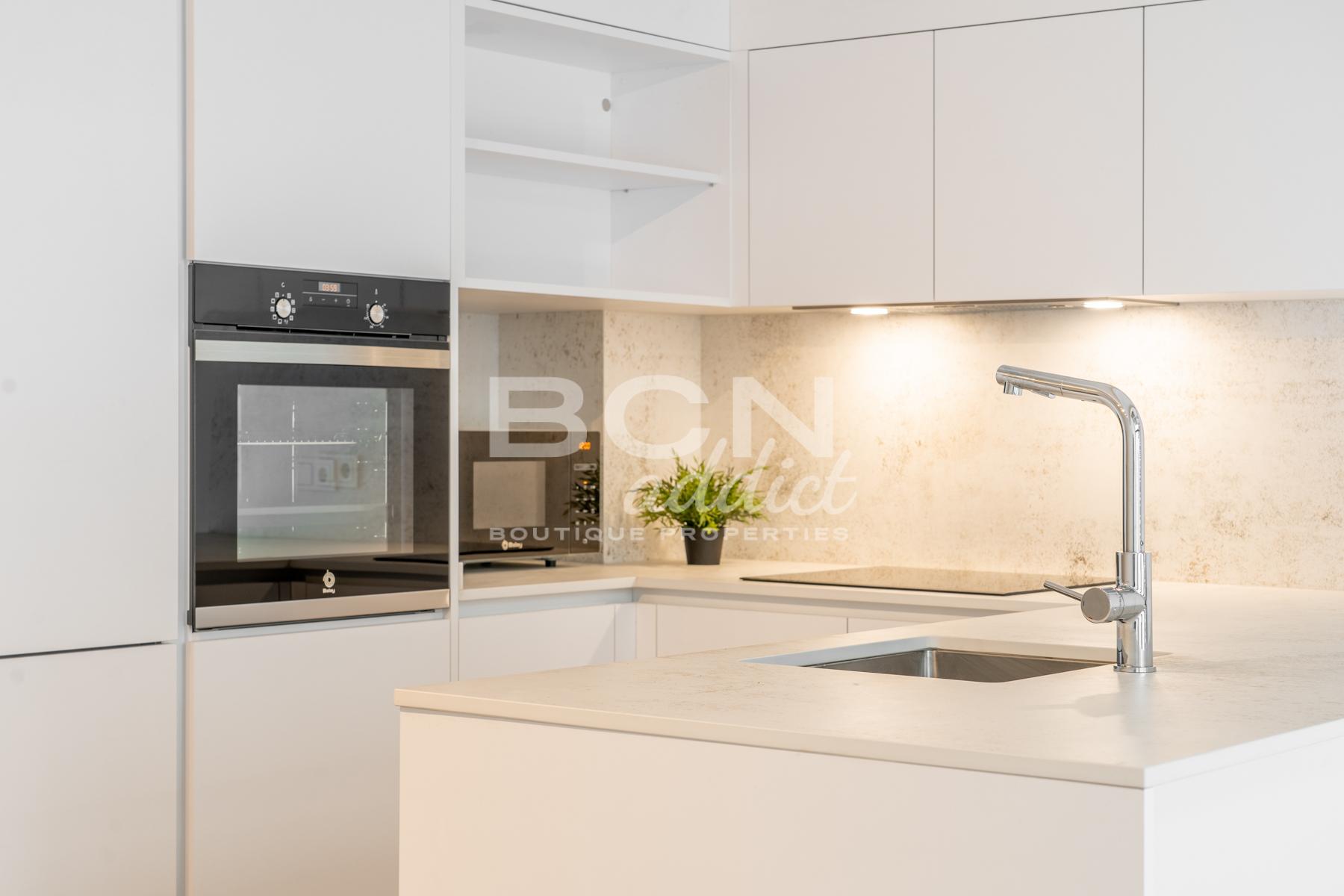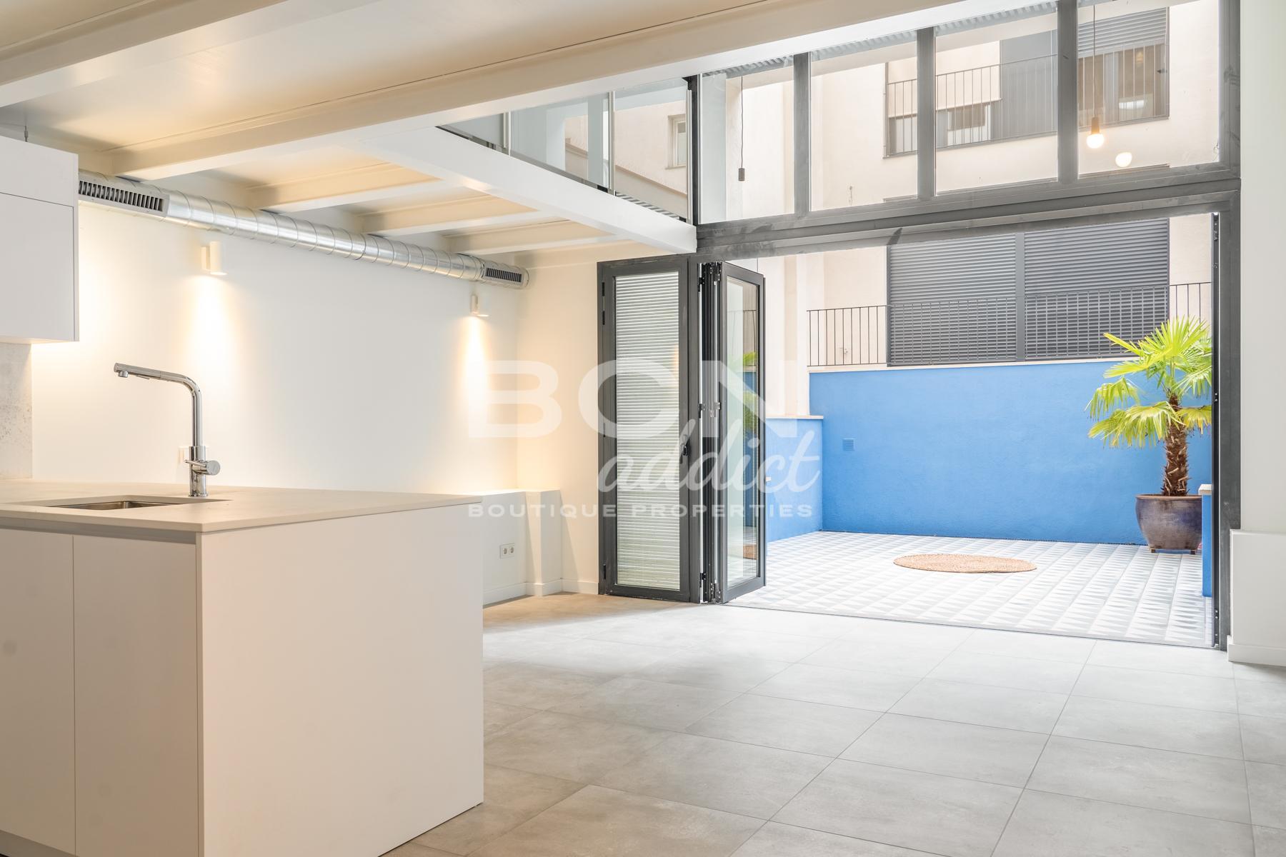 Bajando unos escalones, llegas a amplia cocina abierta conectada con salón, ambos sumergidos en luz natural que entra por pared de vidrio, elemento que junta perfectamente el interior con el exterior: las áreas de porche y patio que crean espacio de 30m2. Equipados con cocina al aire libre forman zona verde que constituye un sitio perfecto para disfrutar largos días de verano en Barcelona y permite admirar naturaleza también de dentro.