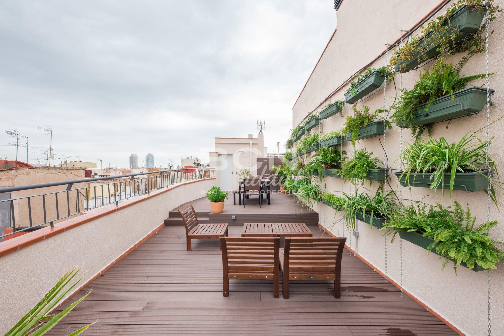 Una magnífica terraza privada de 40 m2 justo una planta encima de la propiedad, ofrece vistas panorámicas a la ciudad y las colinas del Tibidabo en segundo plano. La terraza viene con pavimento de lamas de compuesto, jardín vertical, ducha, muebles para exteriores (silla y mesa de centro), bajante, grifo de agua y acceso a la electricidad. Es un espacio apreciable para un uso multifuncional.