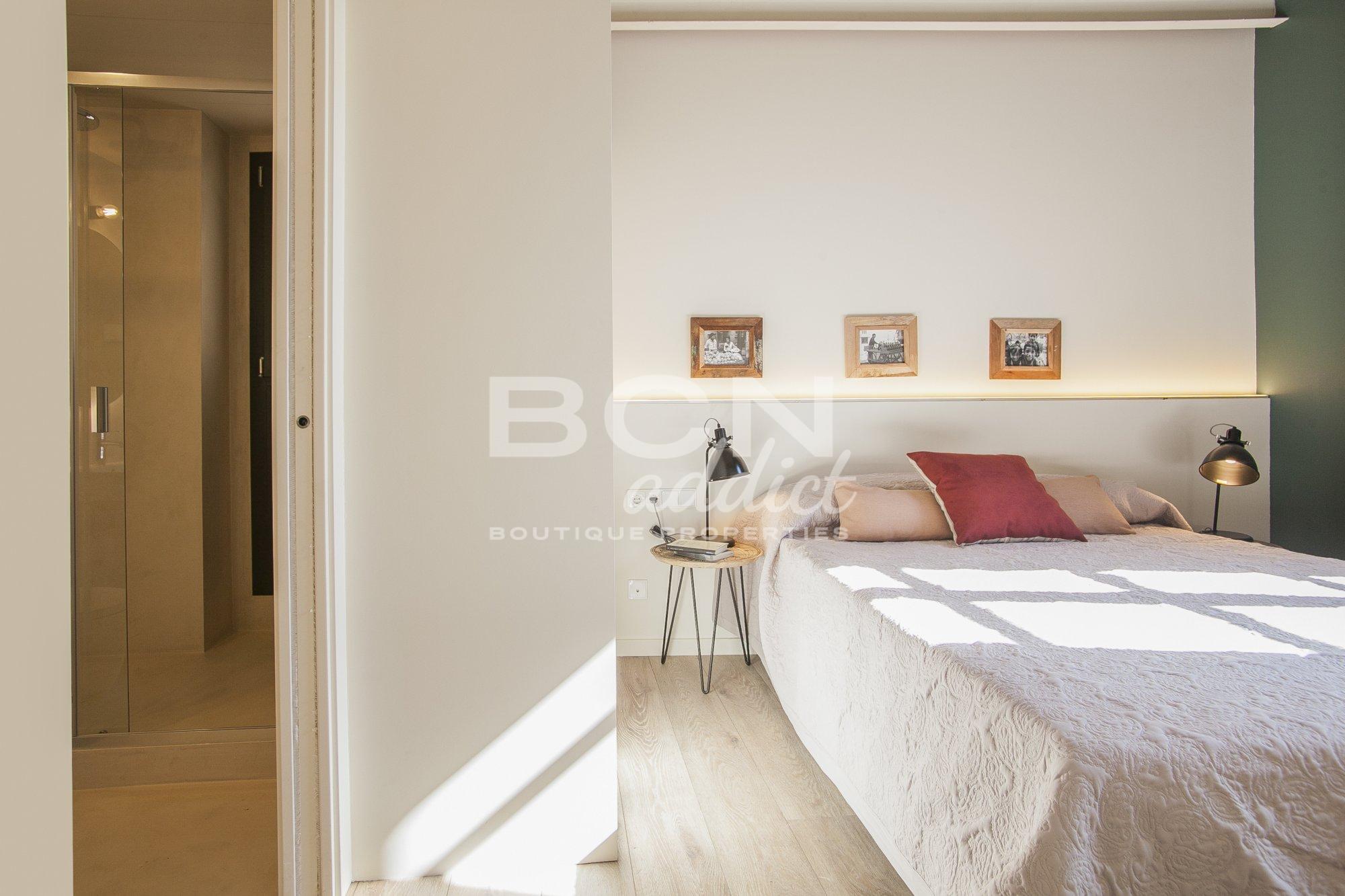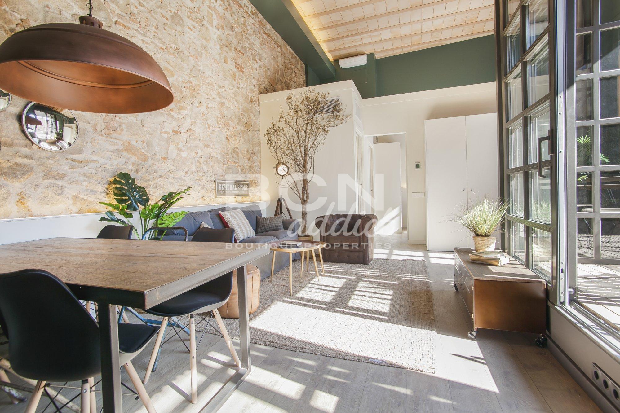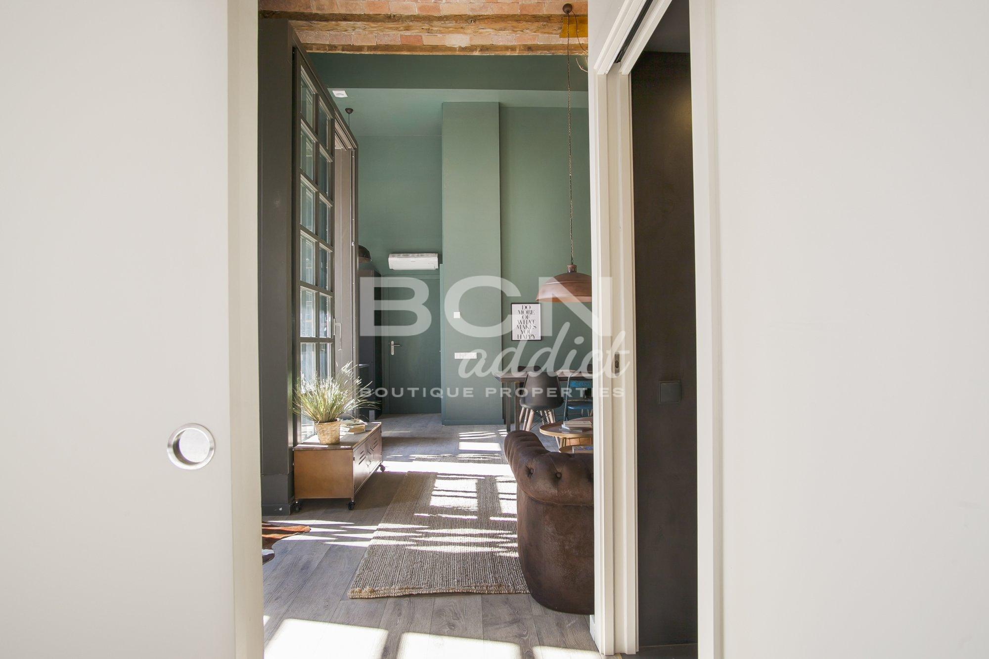 Cercar Original apartamento totalmente exterior y completamente equipado ubicado en la 2ª planta con 2 habitaciones y 2 baños completos. Terraza con vistas a la zona comunitaria. Zona de 16m2 de altillo para otra habitación o zona de trabajo. Techos antiguos con ´volta catalana´ de 5m.