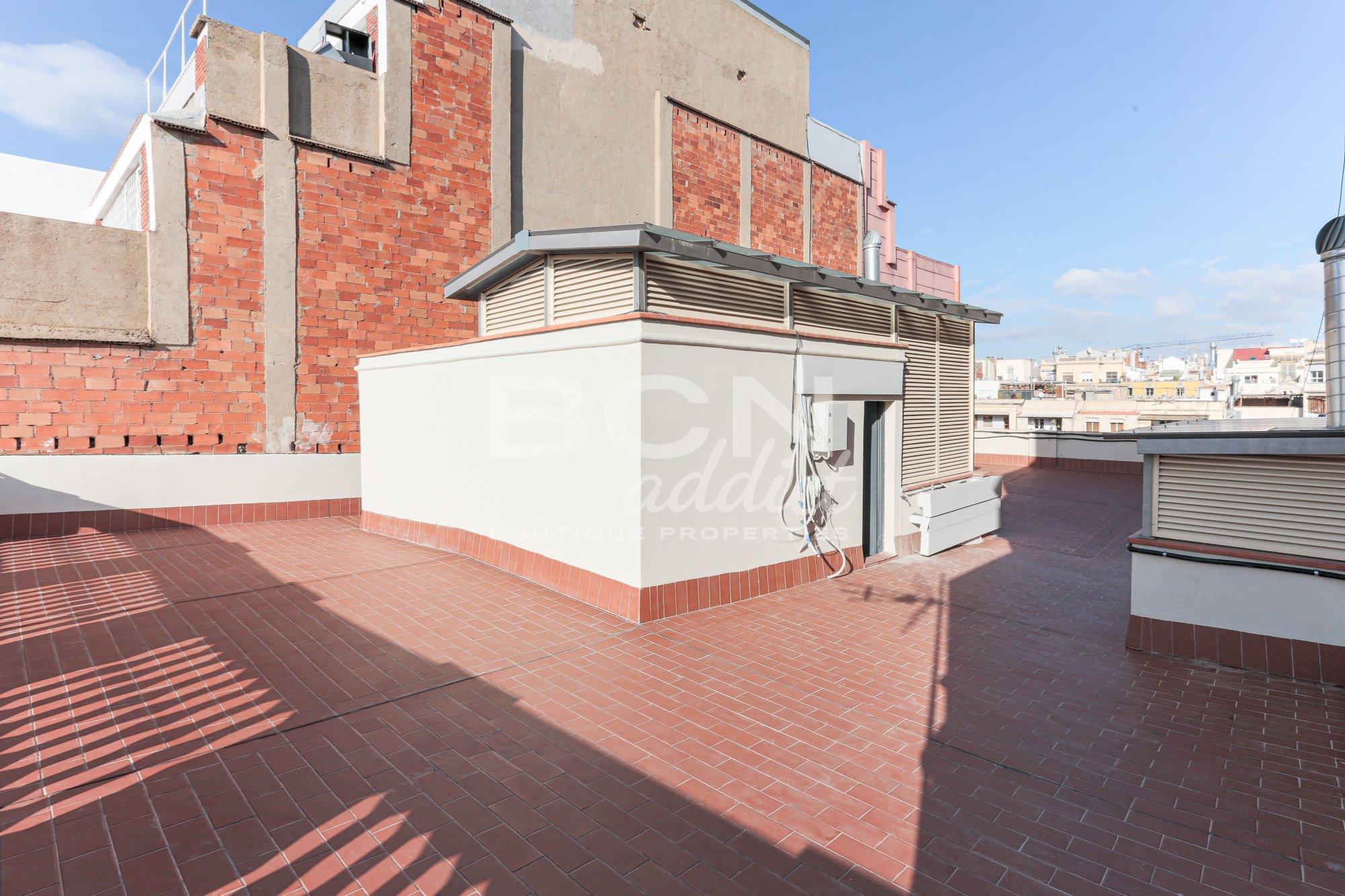 La fachada y las zonas comunes han sido completamente renovadas, conservando todo el encanto de los edificios modernistas : una fachada con molduras y balcones de hierro forjado, áreas comunes con suelos de mármol blanco y paredes decoradas con cerámica y molduras florales en tonos verdes y marrones. Desde el vestíbulo hasta la terraza comunitaria, se puede apreciar la armonía entre los detalles modernistas y los elementos de confort actuales, como el ascensor y las salidas de ventilación en la terraza.
